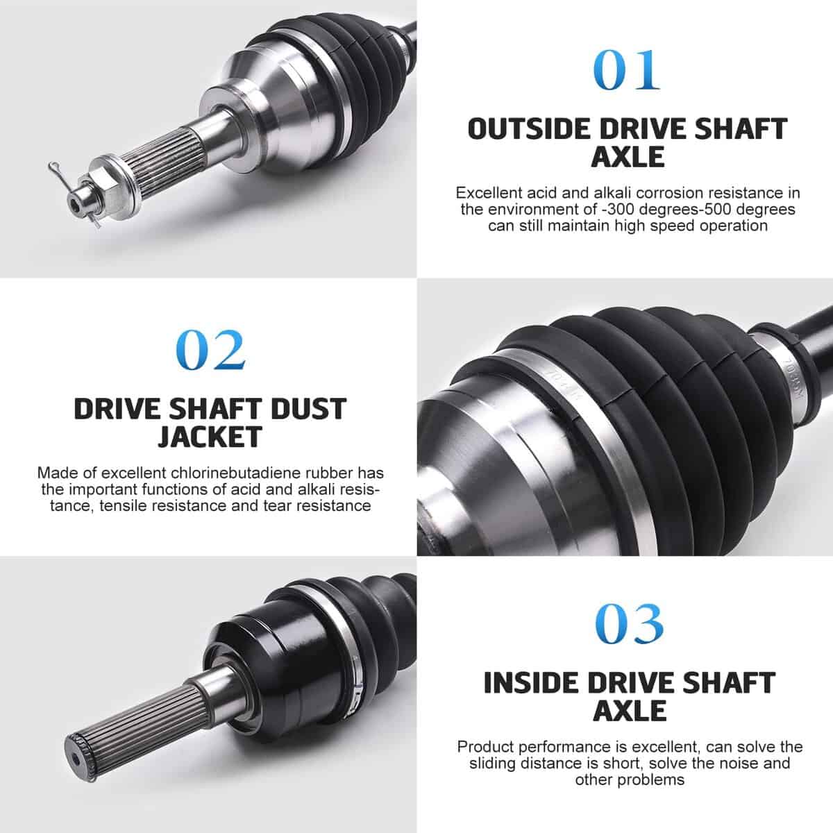 3. Diseño Superior: Todos los componentes del Ensamblaje de Eje de Transmisión CV están mecanizados con precisión para garantizar una articulación suave y un movimiento de desplazamiento para evitar la fricción que puede generar calor adicional. Botas de neopreno para protección de calidad contra temperaturas extremadamente altas o bajas.