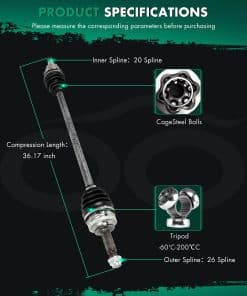 1. ¡Ajuste perfecto para el eje de transmisión del lado del pasajero delantero para Toyota Prius Base 1.5L 2004-2009, Toyota Prius Touring 1.5L 2007-2009! 2. Número de OE de referencia 1pc eje de transmisión; 66-5267. 3. Especificaciones del producto: Posición: Lado del Pasajero Delantero Derecho; Recuento de Estrias Internas: 20 estrias; Recuento de Estrias Exteriores: 26 estrias; Longitud Comprimida: 918 mm; Anillo ABS Incluido: Sí; Recuento de Dientes del Anillo ABS: 48T; Tuerca del Eje Incluida: Sí. 4. Eje de transmisión de alta calidad fabricado con neopreno de calidad y grasa de molibdeno que garantiza que los cojinetes esféricos se mantengan lubricados, proceso de conducción más estable, ayudando a prolongar la vida útil del eje de transmisión. 5. Nota: SCITOO Auto suministra ensamblaje de eje de transmisión para la mayoría de los autos, ¡Por favor seleccione su vehículo (año/marca/modelo/acabado) en la esquina superior izquierda de la página para confirmar la compatibilidad o consulte la información del vehículo en la descripción.