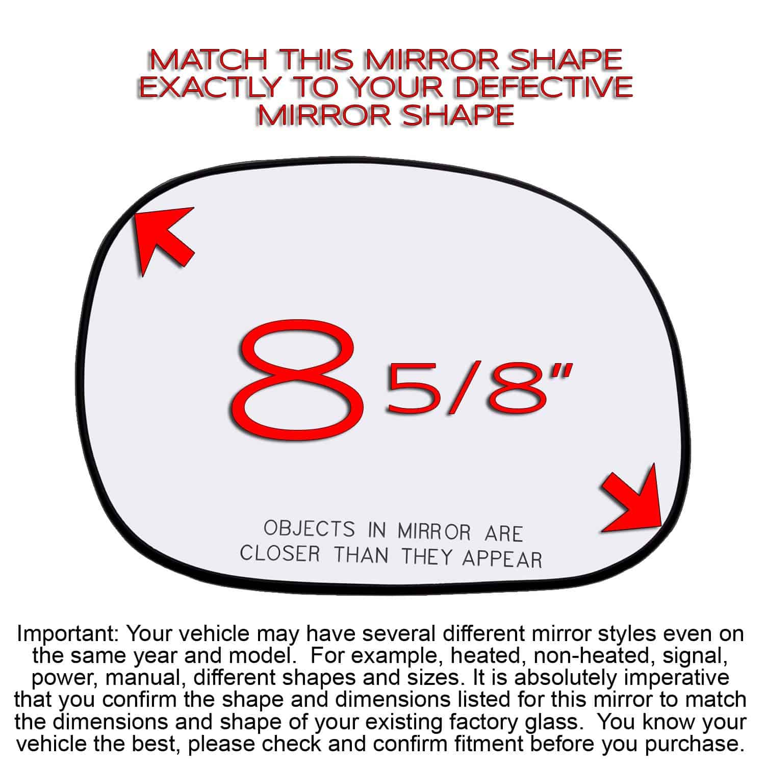 Ensamblaje de espejo retrovisor completo con placa trasera de plástico no calefaccionado compatible con modelos Ford F150, F250 y Expedition de los años 1997 a 2003. Este espejo de reemplazo está diseñado para el lado del pasajero y no cuenta con calefacción. Las medidas del espejo son 8-5/8 pulgadas en diagonal, 8-1/4 pulgadas de longitud y 6-1/8 pulgadas de altura. Es importante verificar y hacer coincidir la forma, medidas y atributos para asegurar un ajuste adecuado. Tenga en cuenta que este espejo no es autodimensionable y no ofrecemos garantía de que funcione con automóviles equipados con funciones de autodimensionamiento.