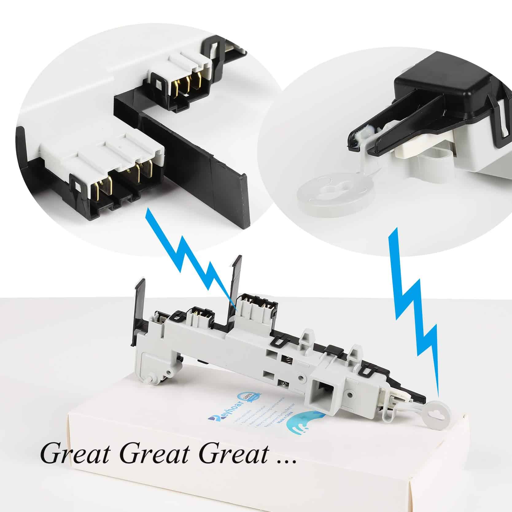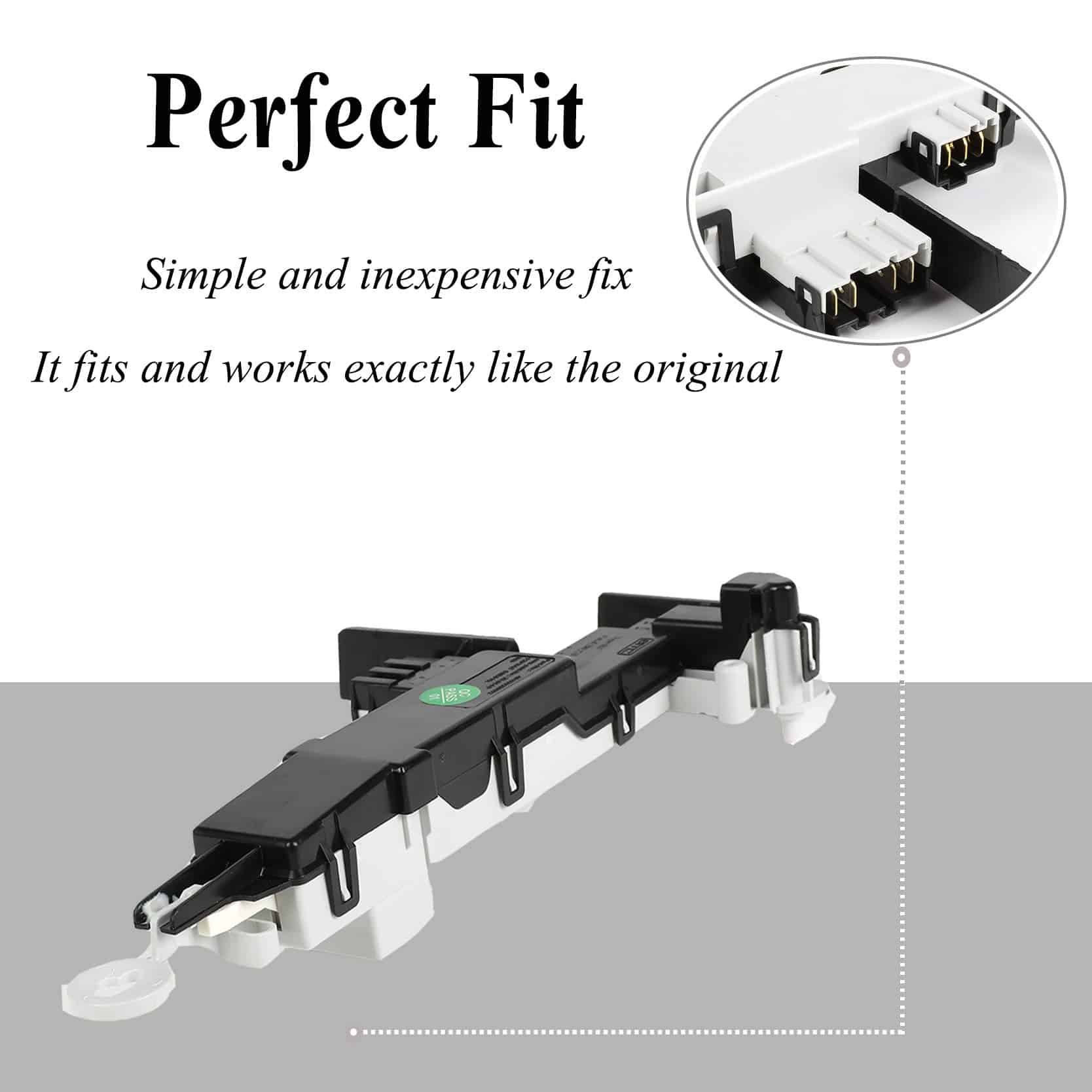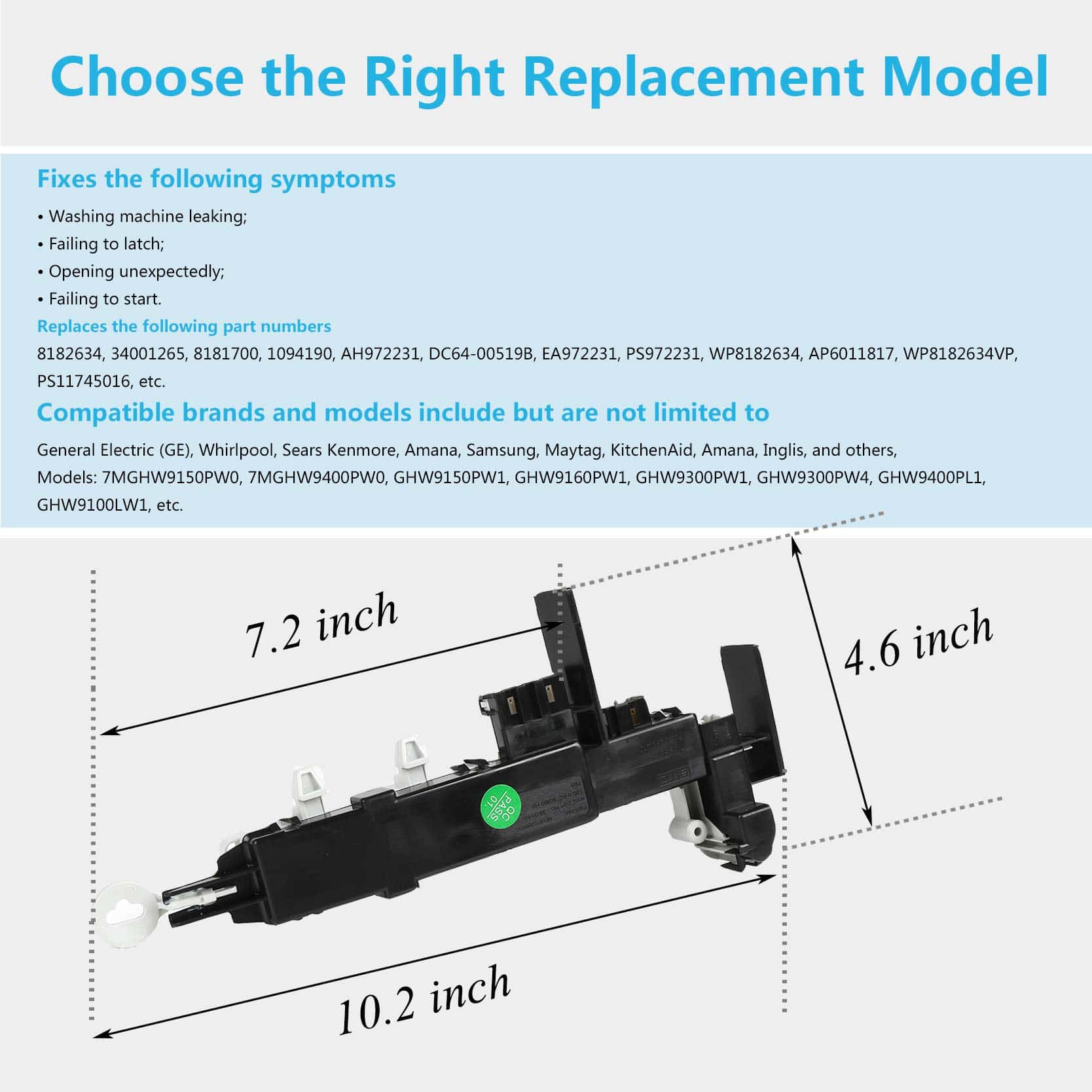 Un ensamblaje de interruptor de bloqueo de puerta de lavadora mantiene la puerta de la lavadora cerrada para reducir el riesgo de fugas o riesgos de seguridad. Cuando esta pieza falla o empieza a fallar, la lavadora puede tener fugas, no cerrar correctamente, abrirse inesperadamente o no iniciar. Producto universal que puede diferir del original. Siempre toma las precauciones de seguridad adecuadas al realizar el mantenimiento o reparaciones. Repara los siguientes síntomas: 1. Fugas de la lavadora; 2. No cierra correctamente; 3. Se abre inesperadamente; 4. No inicia. Reemplaza los siguientes números de parte: 8182634, 34001265, 8181700, 1094190, ah972231, dc64-00519b, ea972231, ps972231, wp8182634, ap6011817, wp8182634vp, ps11745016, etc. Modelos compatibles incluyen pero no se limitan a: Modelos: 7mghw9150pw0, 7mghw9400pw0, ghw9150pw1, ghw9160pw1, ghw9300pw1, ghw9300pw4, ghw9400pl1, ghw9100lw1, etc.