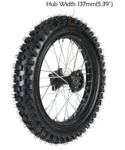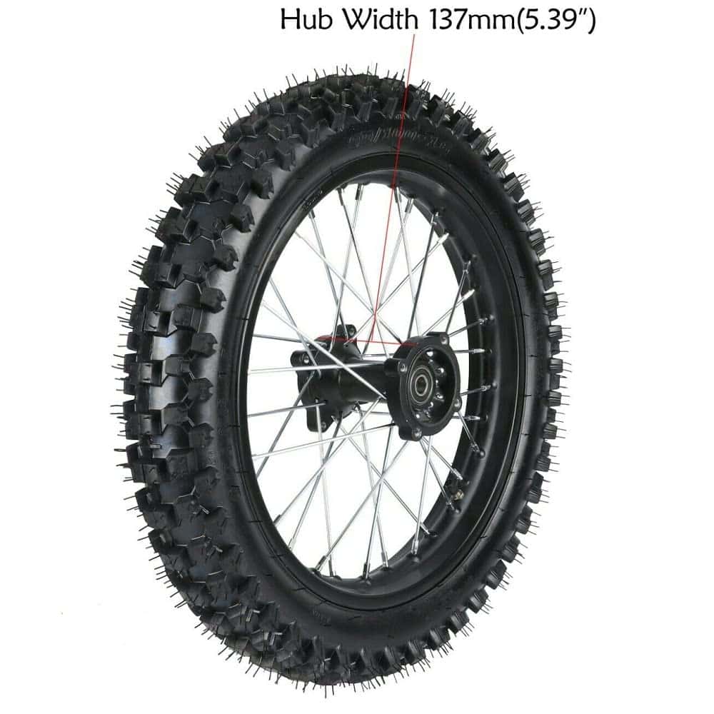 Detalles: Negro 16″ x 1.85″ 32 radios Ancho total de la llanta: 6.86cm 2.7″ Diámetro total de la llanta: aproximadamente 42.5cm 16.75″ Diámetro del orificio central del eje: 15mm .59″ Sprocket: Tamaño de la cadena 428 41 Dientes Distancia entre orificios del sprocket: 64mm 2.52″ de centro a centro Distancia entre orificios del sprocket diagonalmente: 91mm 3.6″ Diámetro exterior del Rotor 187mm 7.37″ Distancia entre orificios del Rotor: 70mm 2.75″ de centro a centro Distancia entre orificios del Rotor diagonalmente: 100mm 3.93″ Rodamientos: 6202RS Ancho de la llanta a través de la rueda: 132.35mm (ver imagen) Utiliza un neumático de 3.00 x 16 (90/100-16)