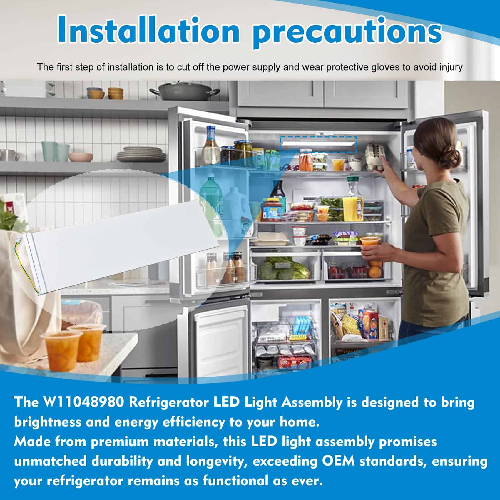 Nuestra luz LED de refrigerador w11048980 está hecha de materiales de alta calidad, combinados con un proceso avanzado, el ensamblaje de luz LED de refrigerador W11470191 pasa por estrictas pruebas de producto antes de salir de fábrica, y la calidad supera ampliamente a OEM. Ensamblaje de luz LED de refrigerador W11048980 para luz de refrigerador Whirlpool, módulo de luz de refrigerador KitchenAid, etc.; modelos reemplazables: Luz LED W11032353, Luz LED de refrigerador W11032355, Luz LED de refrigerador W11470191, Luz LED de refrigerador W11455230, Luz LED de refrigerador 4978613, Luz LED de refrigerador OEM27959970, Luz LED de refrigerador PS16218118, Luz LED de refrigerador EAP16218118, Luz LED de refrigerador FIX16218118. Ensamblaje de luz LED de refrigerador w11048980 w11470191 compatible con luz de refrigerador Whirlpool, luz de refrigerador KitchenAid, etc: Luz LED WRQA59CNKZ, luz led de refrigerador KRQC506MPS00, etc. El refrigerador Whirlpool w11048980 es el ensamblaje real de luz LED, no el anillo de plástico pegado alrededor de la luz, por favor confirme claramente al comprar. La sustitución del ensamblaje de luz LED de refrigerador w11048980 es fácil de hacer, la luz se monta enrasada sin ranuras aparentes u aberturas en el marco alrededor de la luz. Tenga cuidado de no dañar ninguna superficie circundante al quitarla. Retire cuidadosamente el marco con un destornillador plano fino o una palanca de plástico. Los componentes son una cubierta transparente, un marco de plástico y la luz LED pegada dentro de la cubierta transparente. Todas las partes están fijadas con hebillas, y el desmontaje es muy sencillo. Puede usar un destornillador de cabeza plana para ayudar a sacarlas. Estimados clientes, ofrecemos servicio de garantía de 1 año. Si su luz de refrigerador W11048980 enfrenta algún problema durante el uso, avísenos a tiempo, le responderemos dentro de 12 horas para ayudarle a resolver los problemas que encuentre. Su estímulo es el mayor reconocimiento para nosotros. Le deseo una vida feliz.