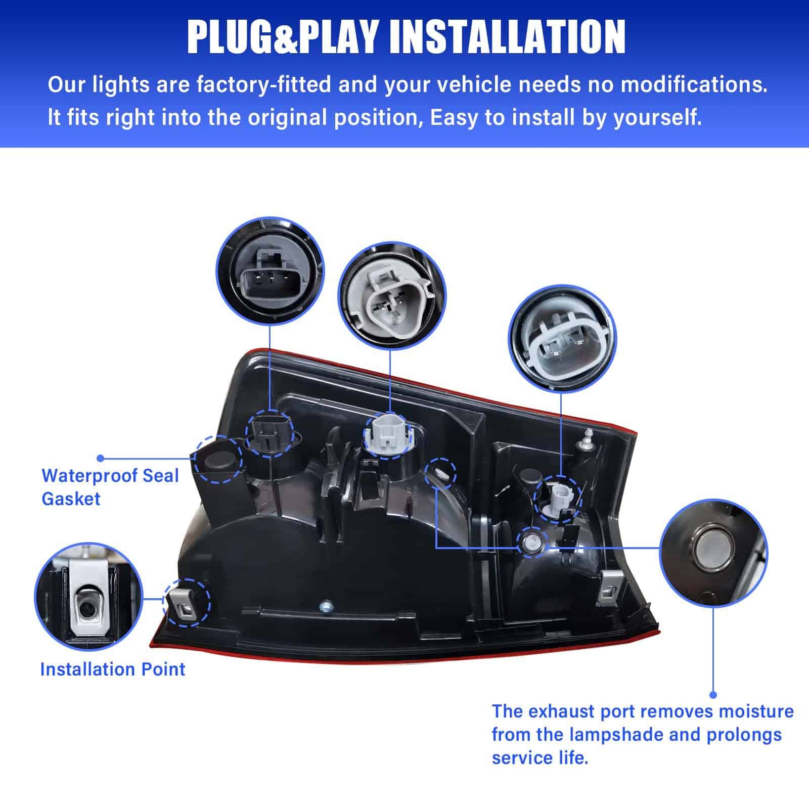 3. Durabilidad La carcasa de alta resistencia soporta golpes y vibraciones. Con silicona completamente sellada que evita daños ambientales como congelación, neblina, decoloración, corrosión y proporciona un servicio confiable en todo tipo de condiciones climáticas como lluvia, nieve o tormentas de polvo, lo que permite que su automóvil se vea mejor y conduzca de manera más segura.