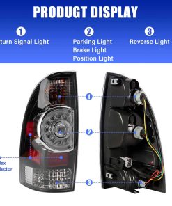 Ensamblaje de luz trasera automotriz compatible con modelos Toyota Tacoma 2005-2015. Este montaje incluye luz de freno y bombilla, diseñado para el lado izquierdo del vehículo. Asegúrese de actualizar su luz trasera con este producto de alta calidad.