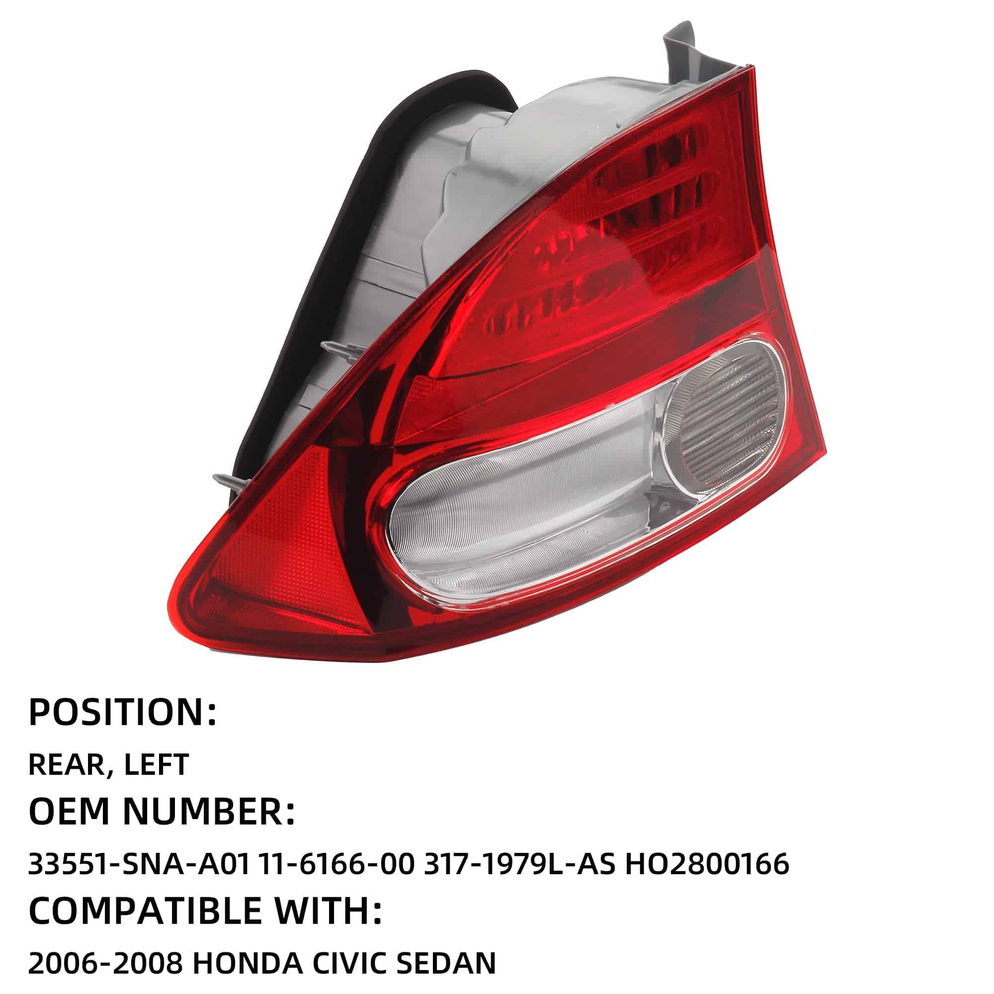 Ensamblaje de luz trasera izquierda Dasbecan compatible con Honda Civic Sedan Hybrid 2009 2010 2011. Reemplaza los números de parte 33551SNAA51, HO2818138, 33551-SNA-A51, B01AY1FQMQ. Cada parte ha pasado por una serie de rigurosas pruebas antes de salir de la fábrica, garantizando su calidad y durabilidad. Esta luz trasera cumple con los estándares DOT y SAE. Hecho de material duradero, resistente a los impactos, impermeable y a prueba de polvo. Diseñado para adaptarse al lado izquierdo del vehículo. El paquete incluye una luz trasera izquierda para Honda Civic (no incluye bombillas). Producto de postventa, diseñado para adaptarse a la serie de sedanes Honda Civic. El nuevo diseño de la carcasa protege la bombilla de la humedad, prolongando su vida útil.