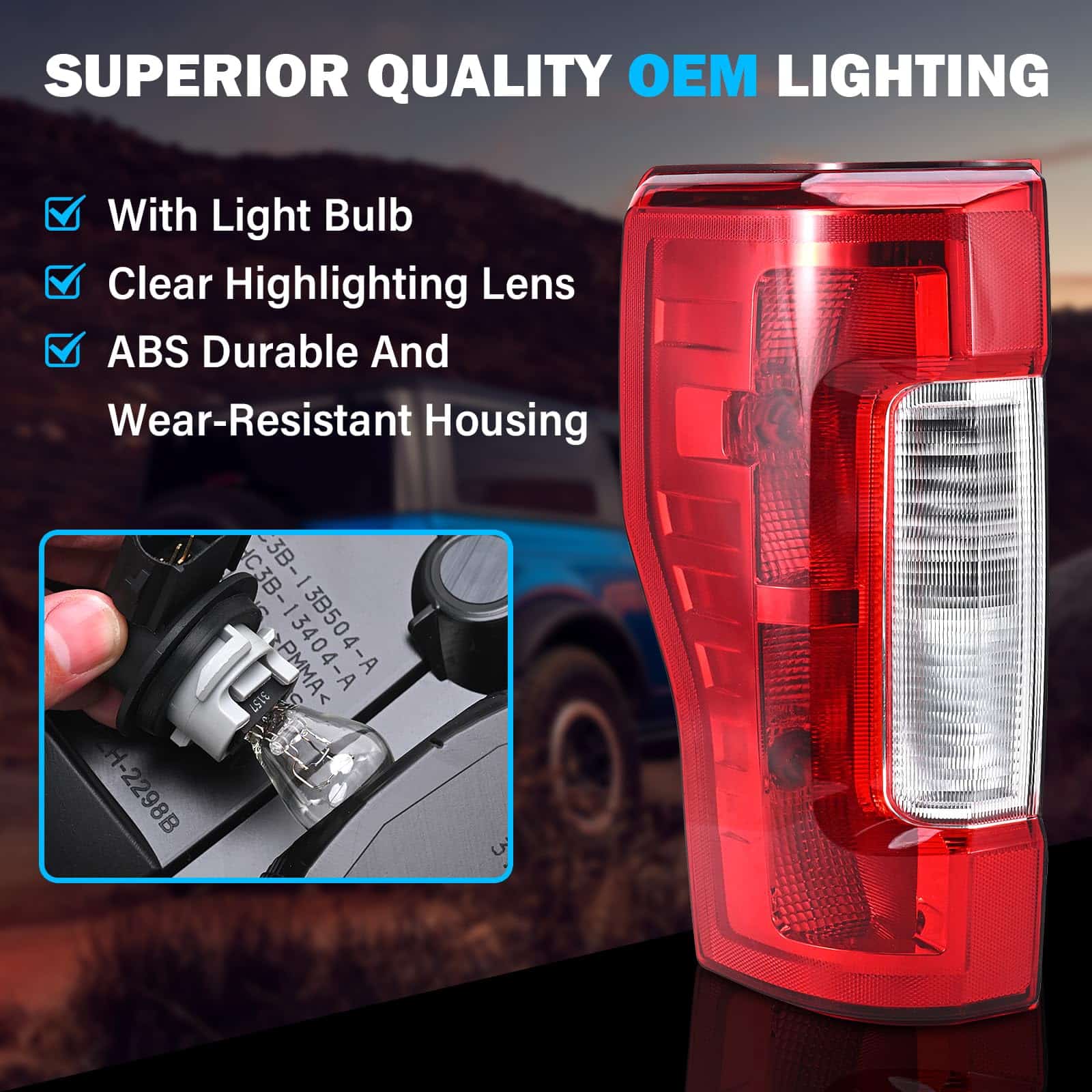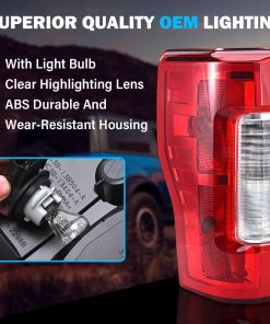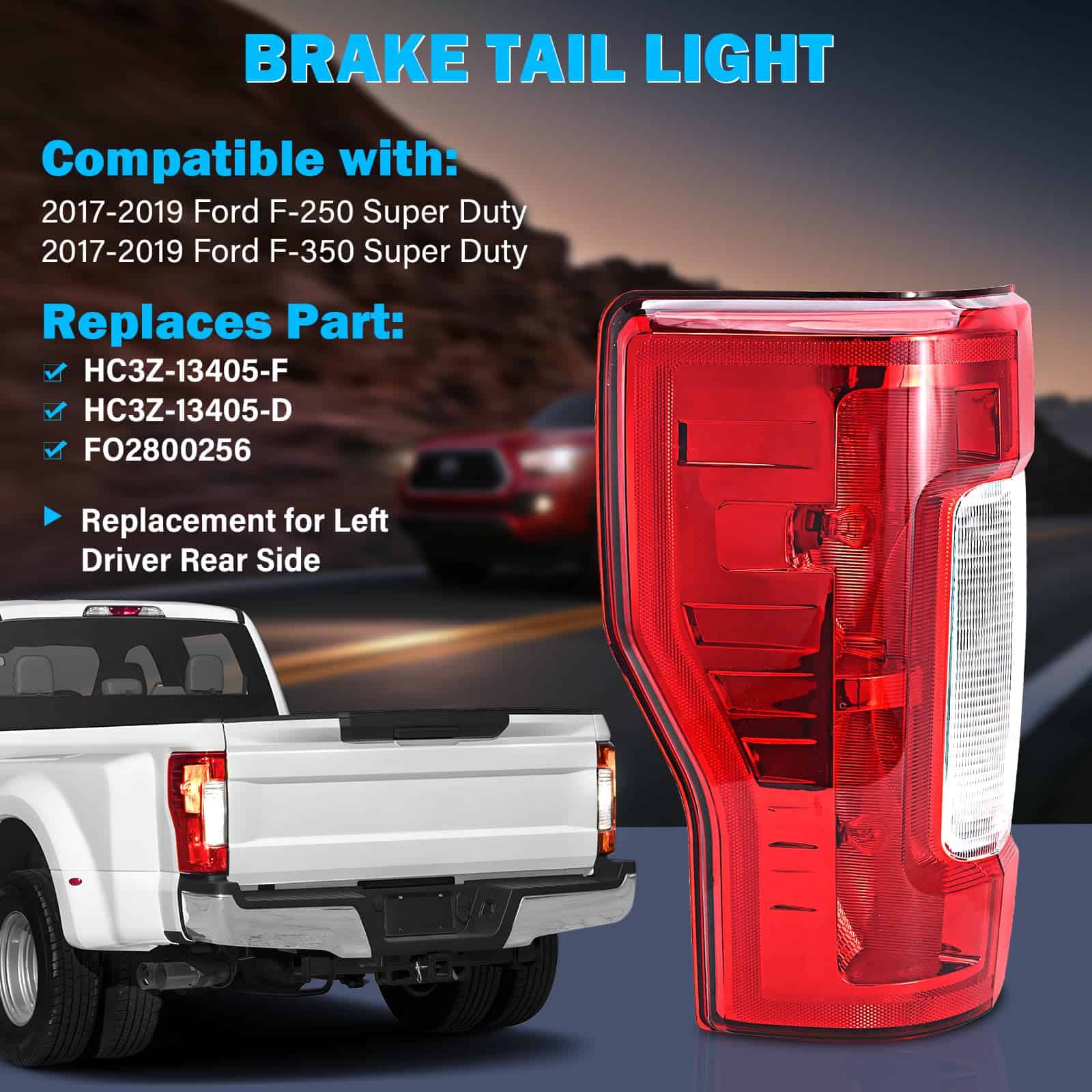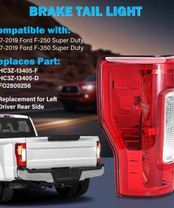 Ensamblaje de Luz Trasera Izquierda del lado del conductor BeamTrack F250 F350 Compatible con Ford F-250 F-350 Super Duty 2017 2018 2019 Luces de Freno (sin Punto Ciego) (sin LED) Reemplazar HC3Z13405F. Ajuste : Ensamblaje de luz trasera BeamTrack compatible con Ford F250 F350 super duty 2017 2018 2019 (sin punto ciego) (sin LED) Números de parte de reemplazo: HC3Z-13405-F, HC3Z-13405-D, FO2800256. Por favor, verifique el modelo y el número de parte cuidadosamente antes de comprar para facilitar la compra del producto correcto. Superior Quality : El ensamblaje de luz trasera es robusto, con buena resistencia al impacto y excelente efecto impermeable, que puede proporcionar suficiente brillo para la conducción nocturna y en días de lluvia. Fácil de Instalar: El ensamblaje de luz de freno cumple… (Texto truncado)