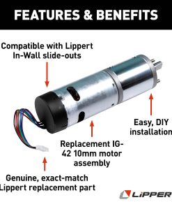 Nadie quiere quedarse en casa, perdiendo un divertido fin de semana de acampada, porque el equipo de su RV no funciona como debería. Por eso, en Lippert, te ayudamos a eliminar la incertidumbre de las piezas de reemplazo al proporcionar componentes de reemplazo directos que harán que tu vehículo vuelva a funcionar como de costumbre. Nuestro ensamblaje de motor de reemplazo te ayudará a poner en marcha de nuevo el slide-out en la pared de tu RV. Como una parte de partida exacta, este ensamblaje de motor IG-42 se instala igual que tu equipo original sin necesidad de ensamblaje. Este es un motor de reemplazo IG-42 de 10 mm para varios slide-outs de RV en la pared. Consulta tu manual del propietario antes de la compra para asegurar la compatibilidad. Ya sea en la carretera o en el agua, Lippert suministra una amplia gama de productos premium para RV, remolque y marinos diseñados para mejorar todas tus actividades recreativas. Nuestro equipo está comprometido a pensar siempre en tu próximo viaje, empujando las posibilidades de nuestros productos y servicios, todo para mejorar tu tiempo al aire libre, siempre, donde sea, durante años venideros.