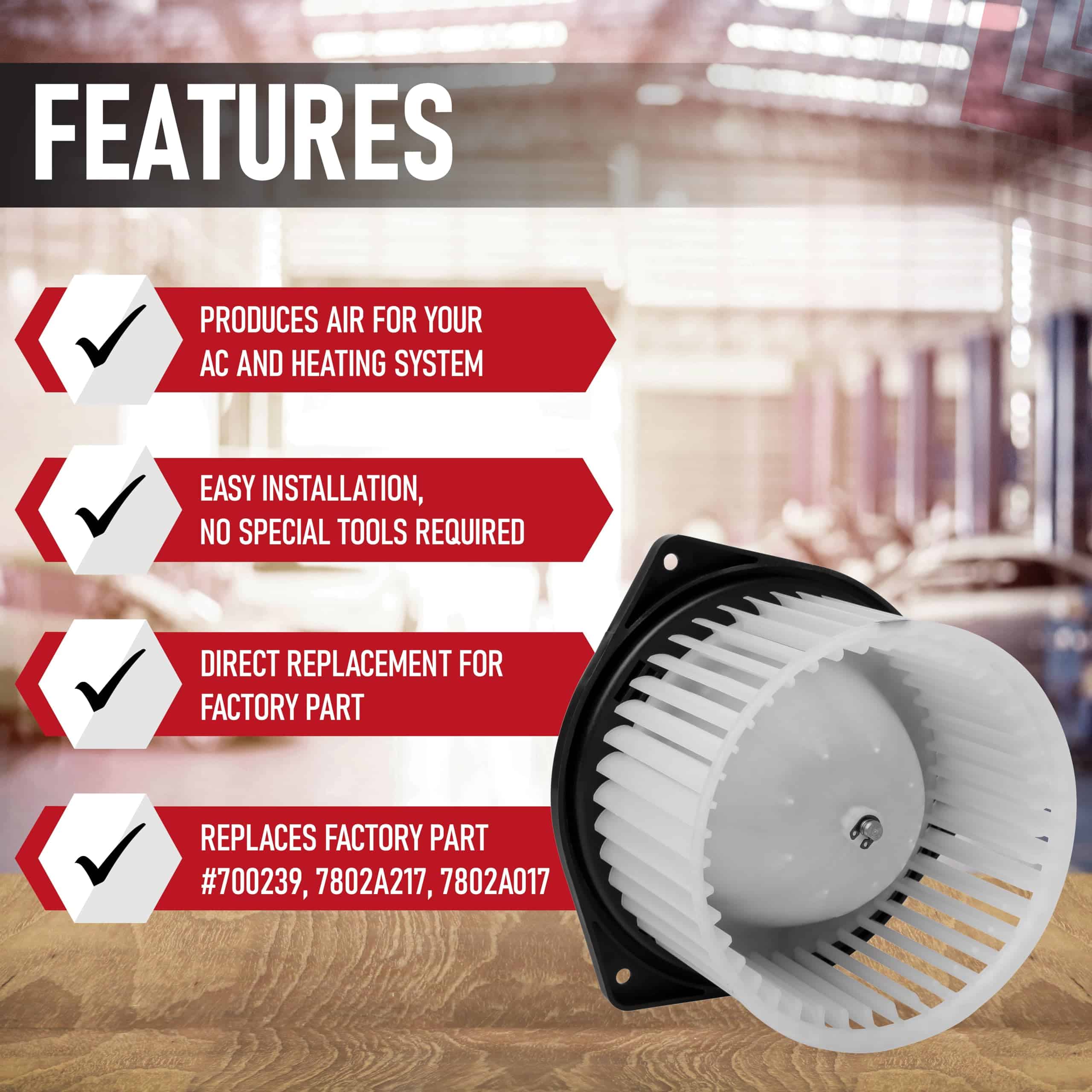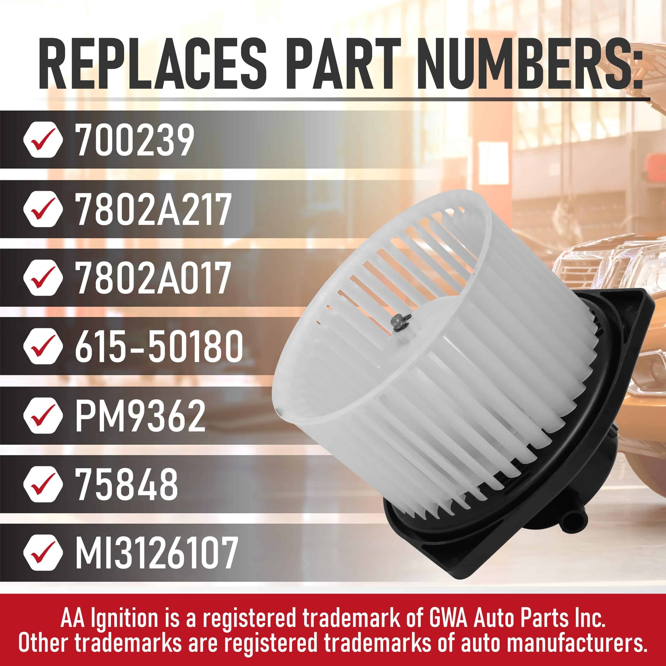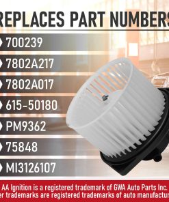 Ensamblaje de Motor del Ventilador de Repuesto por AA Ignition – Compatible con Vehículos Mitsubishi – Lancer 2008-2017 & Outlander 2008-2018, Sport 2013-2017 – Reemplaza 700239, 7802A217, 7802A017, PM9362. Este ensamblaje del motor del ventilador de AC de repuesto es responsable de producir aire que pasa a través de las rejillas de aire acondicionado y calefacción de su Lancer, Outlander y Outlander Sport. Si su aire acondicionado o calefactor no produce ni circula aire caliente o frío, entonces es posible que tenga un problema con su motor del ventilador. Compatible con Vehículos Mitsubishi – Lancer 2008-2017 | Outlander 2008, 2009, 2010, 2011, 2012, 2013, 2014, 2015, 2016, 2017, 2018 | Outlander Sport 2013-2017. El motor del ventilador se puede encontrar fácilmente en el lado del pasajero del vehículo dentro de la guantera. Puede ser instalado simplemente quitando unos tornillos. También se recomienda reemplazar su relé/resistencia del motor del ventilador con uno nuevo al reemplazar el motor del ventilador. Reemplaza los números de parte 700239, 7802A217, 7802A017, 615-50180, PM9362, 75848 comúnmente encontrados en modelos populares de Lancer, Outlander y Outlander Sport incluyendo los años 08, 09, 10, 11, 12, 13, 14, 15, 16, 17, 18. Este motor del ventilador de repuesto por AA Ignition viene con el abanico. Obtenga su sistema de calefacción o aire acondicionado funcionando rápidamente. Ajuste, calidad y acabado OEM – Este motor del ventilador hará que su sistema de aire acondicionado vuelva a funcionar en poco tiempo. Aunque no es una pieza OEM genuina, es un reemplazo directo y puede ahorrar dinero y tiempo reemplazándolo usted mismo. Este motor del ventilador viene completo con un . Si el motor del ventilador falla en su vehículo, simplemente contáctenos para obtener un reemplazo gratuito. Esta pieza de repuesto de AA Ignition se puede instalar fácilmente sin necesidad de herramientas especiales. Consulte nuestro sitio web para más detalles.