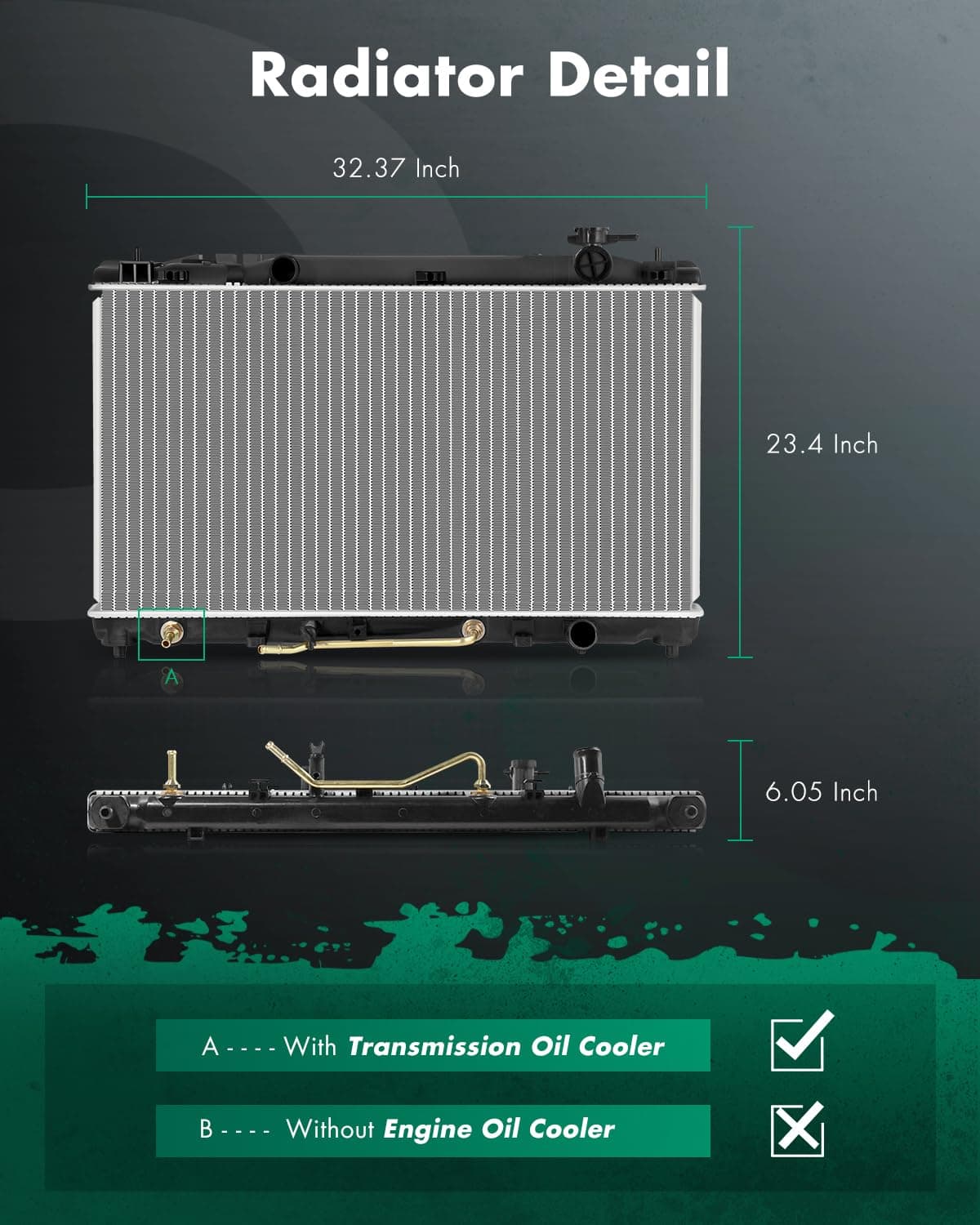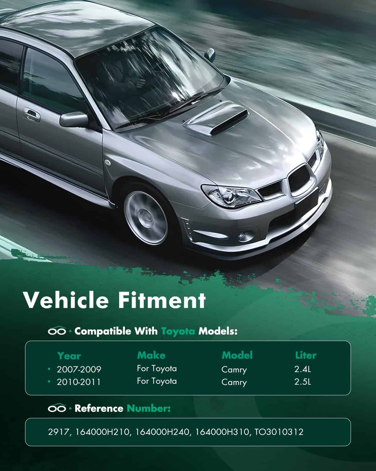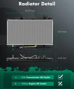 1. Compatible con 2007-2009 para Toyota para Camry 2.4L 2010-2011 para Toyota para Camry 2.5L. 2. Especificaciones: Radiador de Repuesto: Enfriador de Aceite de Transmisión Incluido: Sí; Enfriador de Aceite del Motor Incluido: No; Diámetro de Entrada: 1.38 pulg .; Diámetro de Salida: 1.38 pulg. 3. Número de Referencia: Radiador de Aluminio con DPI2917; Radiador de Coche de Repuesto 2917; 164000H210; 164000V070; 1640028550; TO3010312; radiador de color plateado de repuesto;. 4. Instalación Fácil: Este radiador está diseñado con precisión y es fácil de instalar. Si tiene algún problema durante la instalación o uso, contáctenos, le proporcionaremos soporte técnico profesional. 5. Nota: SCITOO Auto suministra radiadores para la mayoría de coches, SUVs, camiones y remolques. Seleccione su vehículo (año/marca/modelo/acabado) en la esquina superior izquierda de la página para confirmar la compatibilidad o consulte la información del vehículo en la descripción