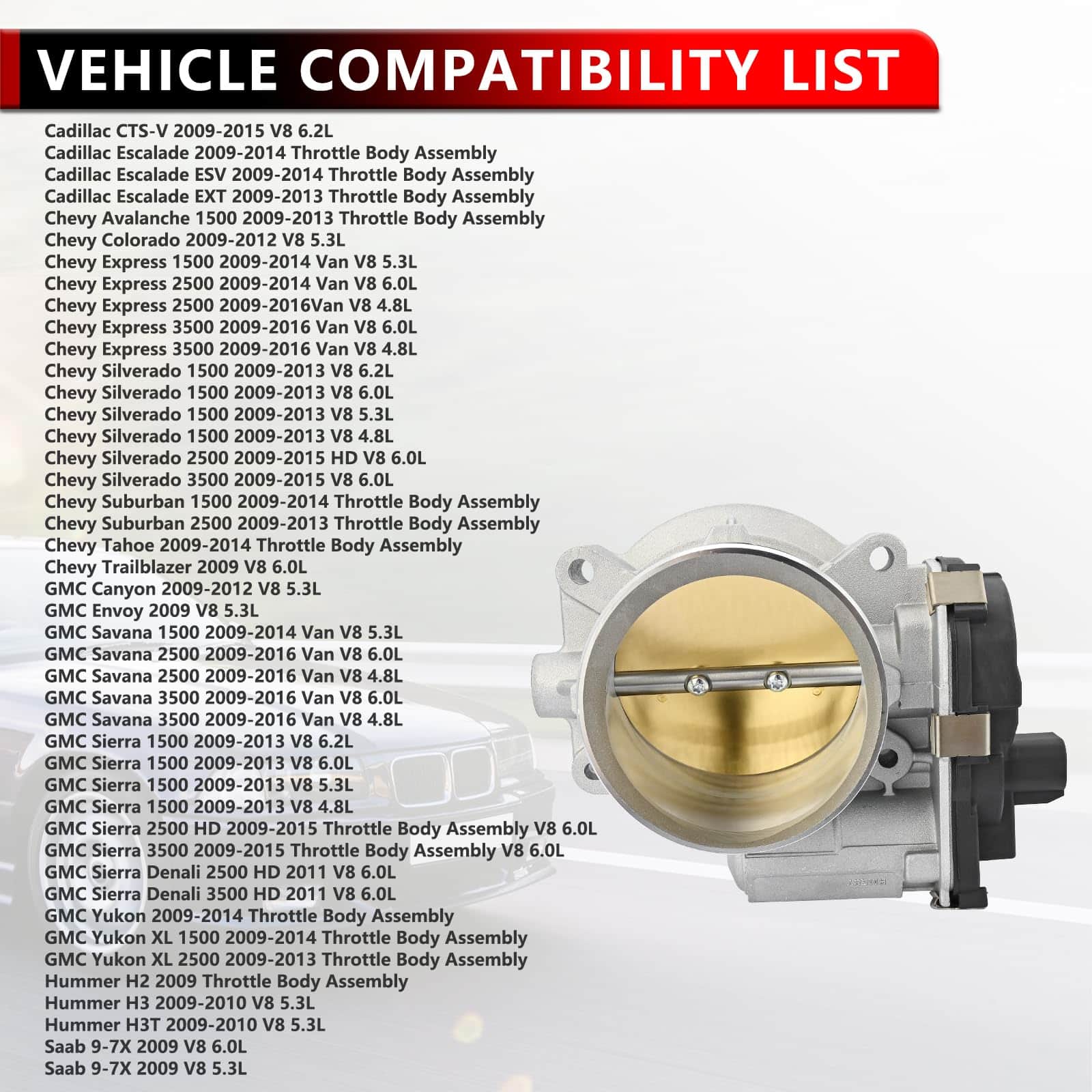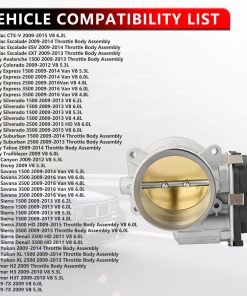 Ensamblaje del cuerpo del acelerador electrónico. Compatible con una amplia gama de modelos de vehículos, incluyendo Chevy Avalanche 1500, Chevy Silverado 1500, GMC Sierra 1500, Cadillac CTS-V, y más. Este producto está diseñado para proporcionar un rendimiento óptimo y una fácil instalación. Incluye números de parte de reemplazo para mayor referencia. Ofrecemos servicio de reemplazo, devolución y reembolso después de la compra, así como soporte para resolver cualquier problema. Para consultas adicionales, no dude en contactarnos.