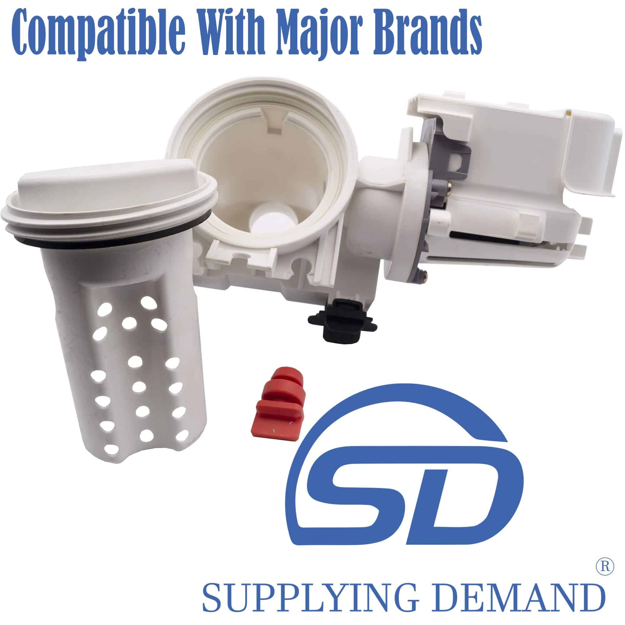 Este es un ensamblaje de filtro y bomba de desagüe para lavadora de carga frontal de Supplying Demand. Por favor, consulte la información de compatibilidad con el número de modelo en la parte inferior de esta página antes de realizar su pedido para esta pieza. Los números de parte alternativos incluyen AP3953640, 285998, 8181684, 8182819, 8182821, AH1485610, EA1485610, PS1485610. Esta pieza no está diseñada para una lavadora de carga superior. Es importante desconectar su lavadora de la corriente y el suministro de agua antes de realizar el servicio. Recomendamos colocar una toalla debajo para cualquier agua residual en las mangueras de desagüe. Las piezas de repuesto de Supplying Demand son compatibles con las principales marcas, pero siempre debe verificar la compatibilidad con su modelo específico. En caso de tener problemas para encontrar su número de modelo, hemos incluido un video útil en la galería de productos, así como información en la descripción a continuación. Los productos SD vienen en un empaque de Supplying Demand.