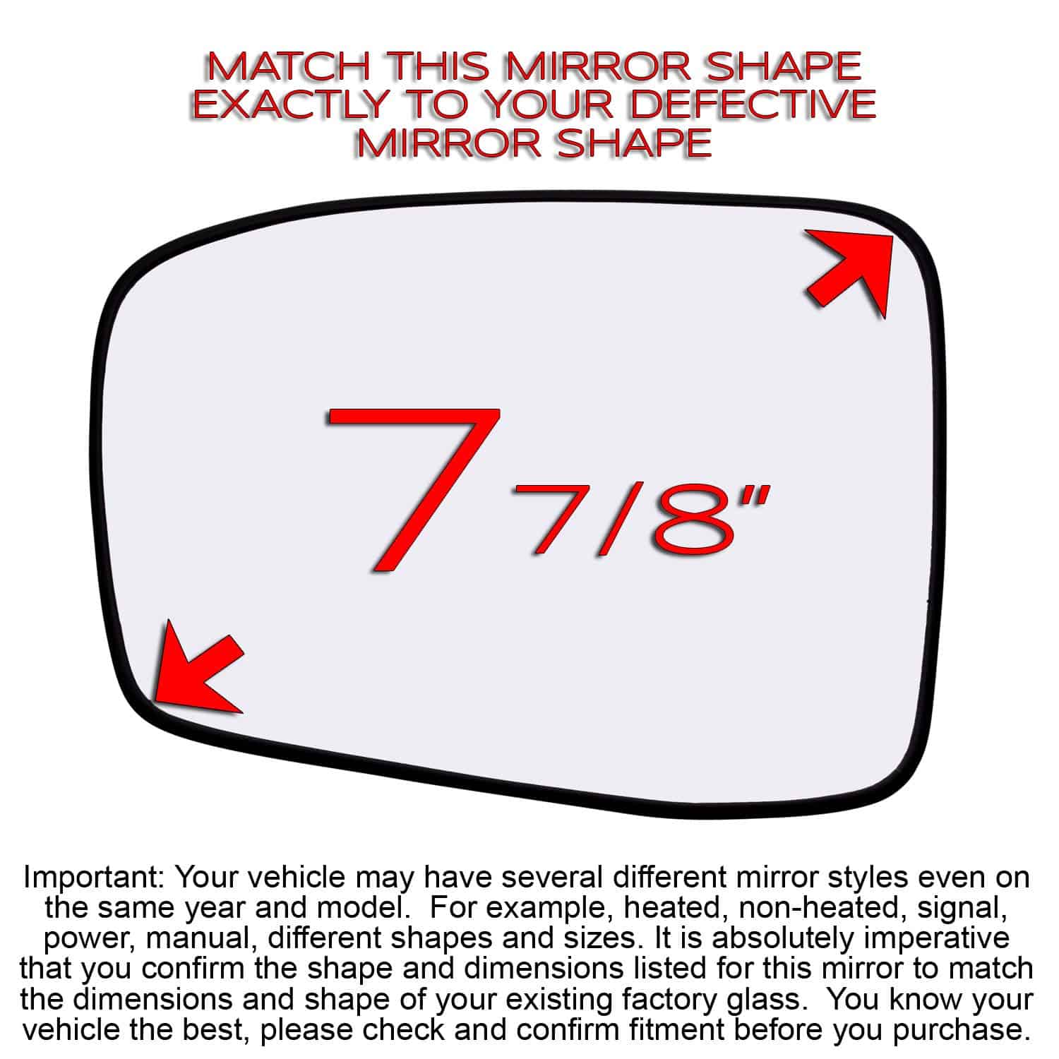 Con este ensamblaje de vidrio del espejo retrovisor del lado del conductor con placa de respaldo de plástico calentada compatible con Honda Odyssey 2005-2010, tendrás la garantía de un reemplazo de alta calidad que se ajusta perfectamente a tu vehículo. El espejo incluye un clip de montaje trasero para una instalación fácil y segura. Con medidas de diagonal de 7-7/8 pulgadas, longitud de 7-1/4 pulgadas y altura de 5-3/8 pulgadas, este espejo garantiza un ajuste preciso. Además, viene con un número de parte alternativo para una identificación rápida y fácil. Ten en cuenta que este espejo no tiene función de atenuación automática y se recomienda a los compradores verificar y hacer coincidir la forma, las medidas y los atributos para una compatibilidad adecuada. Ordena antes de las 2 pm PST y recibirás el mismo día.