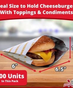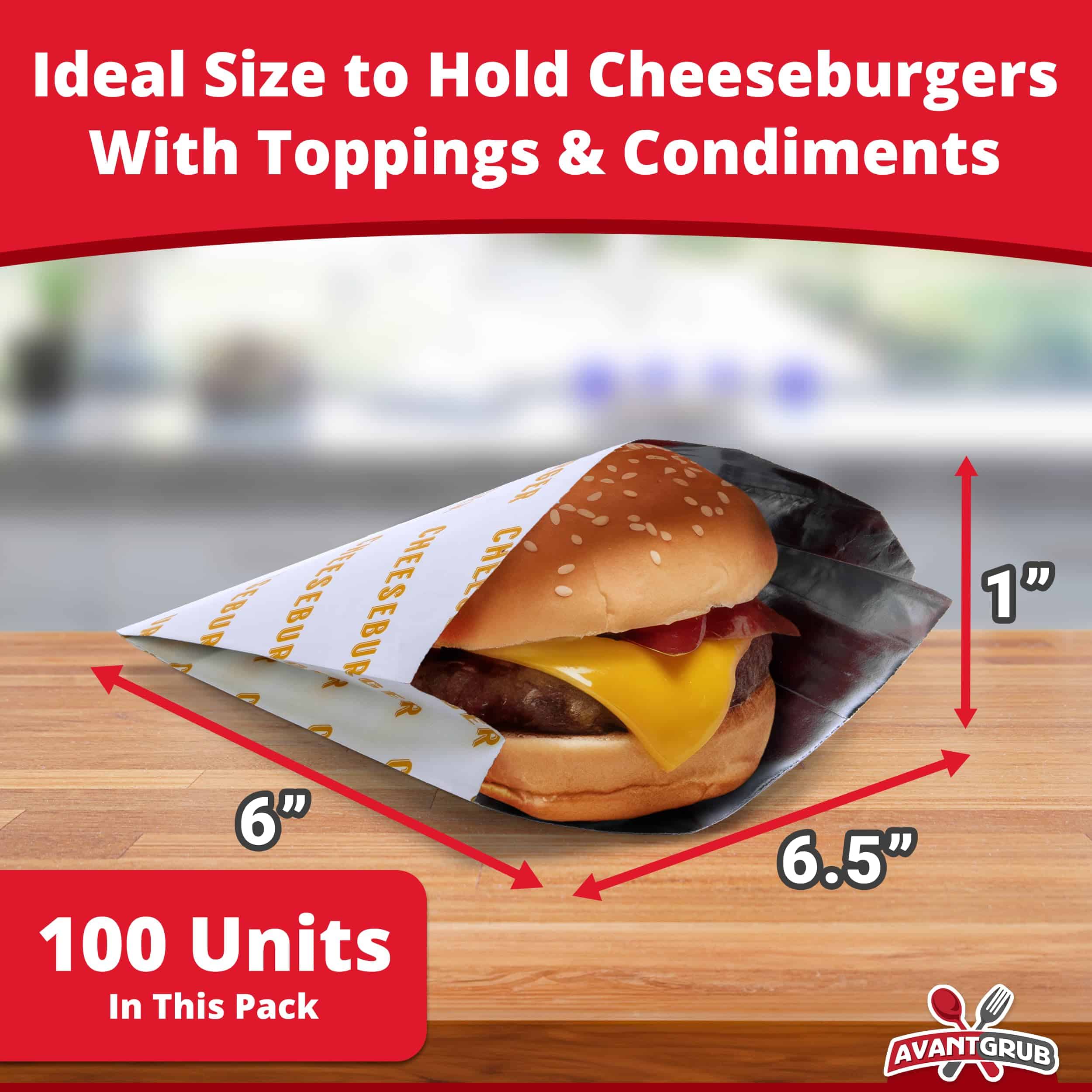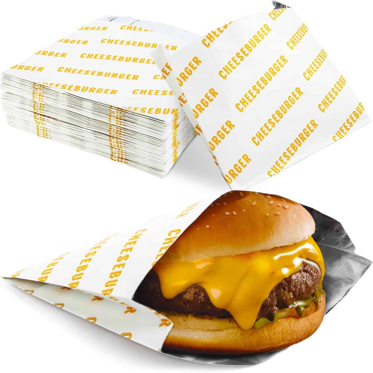 Recibirás 100 bolsas de papel de aluminio para hamburguesas de 6×6.5 pulgadas.