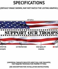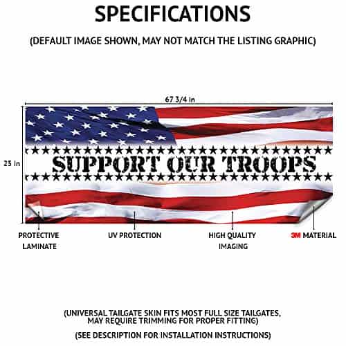 Este artículo es una DECAL universal de 67.75″ X 25″ que se ajustará a la mayoría de los camiones. Lamentablemente, no podemos ofrecer tamaños específicos para modelos. Por favor, mida las dimensiones completas de su puerta trasera en sus puntos más anchos: la calcomanía debe ser más grande que su puerta trasera tanto en altura como en ancho para un ajuste adecuado. Instrucciones de instalación: tenga en cuenta: recomendamos una instalación de dos personas. Si no se siente confiado trabajando con vinilo, por favor, contacte a un servicio de instalación profesional local en su área, como un servicio de detallado de vehículos o de instalación de gráficos. Retire todos los emblemas, letras u otras superficies desiguales de su puerta trasera. También puede optar por quitar la manija. Limpie la superficie de su puerta trasera de polvo o suciedad con un limpiador suave que no sea disolvente, y asegúrese de que la superficie esté seca antes de la instalación (no instalación húmeda). Coloque el diseño de la calcomanía hacia abajo en una superficie plana y retire el respaldo de papel, teniendo cuidado de asegurarse de que la calcomanía no se adhiera a sí misma u otras superficies. Con cuidado de no estirar el vinilo, tire con firmeza y fije la calcomanía en los cuatro ángulos de su puerta trasera. Coloque una tarjeta de crédito / licencia de conducir con un paño suave u otro cobertor y úsela como herramienta de aplastamiento para alisar el vinilo en su lugar, comenzando desde el centro y moviéndose hacia afuera en todas direcciones poco a poco. Vaya despacio y tómese su tiempo. Si se forma una burbuja o pliegue, pele el vinilo lentamente y con cuidado (una vez que el centro esté firmemente en su lugar, las esquinas pueden pelarse hacia atrás) y presiónelo firmemente de nuevo en su lugar, comenzando desde donde se formó la burbuja. Puede usar un secador de cabello o pistola de calor para ablandar el vinilo alrededor de curvas difíciles, bordes o formas irregulares en su puerta trasera, pero esto suele ser opcional y no necesario. Una vez que la calcomanía esté completamente instalada, use una cuchilla X-Acto u otro cuchillo de hobby / afeitar para recortar el exceso de vinilo alrededor de todos los bordes, manijas, luces, etc. ¡Disfrute de su nueva y elegante envoltura de cola!