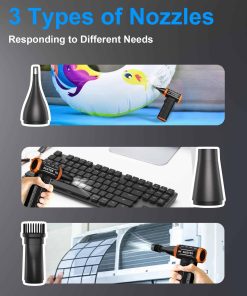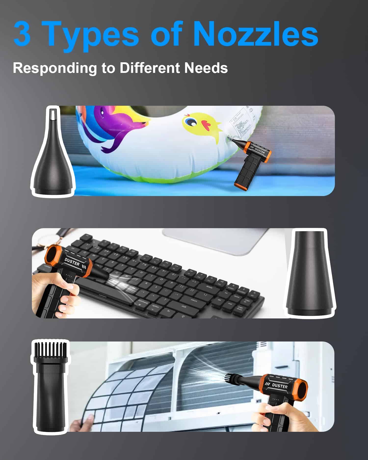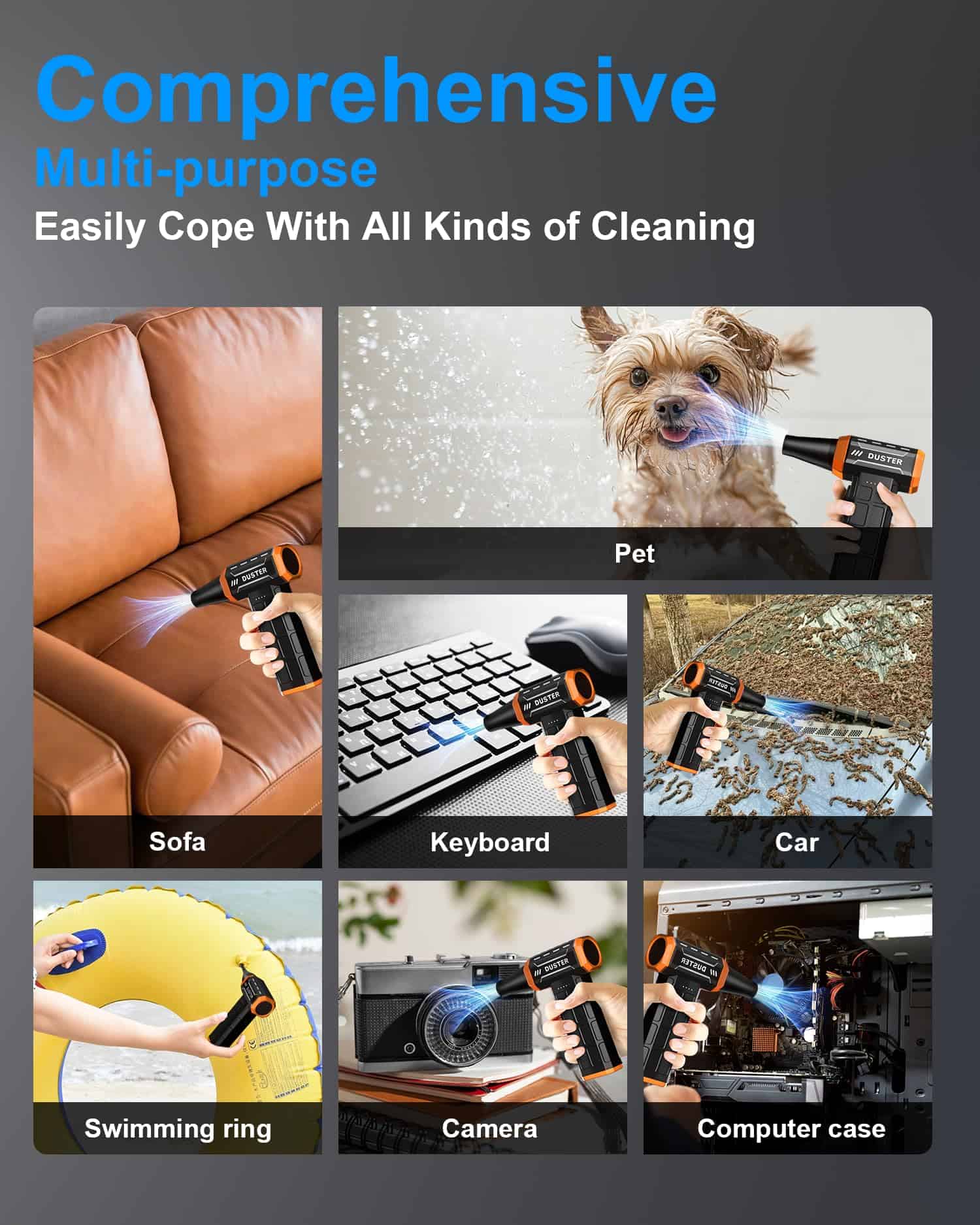 Además, la boquilla reemplazable del soplador de aire facilita la limpieza de áreas de difícil acceso y rincones estrechos. No solo es perfecto para eliminar el polvo, sino que también se puede utilizar como secador de pelo para mascotas o una herramienta sopladora durante actividades al aire libre.
