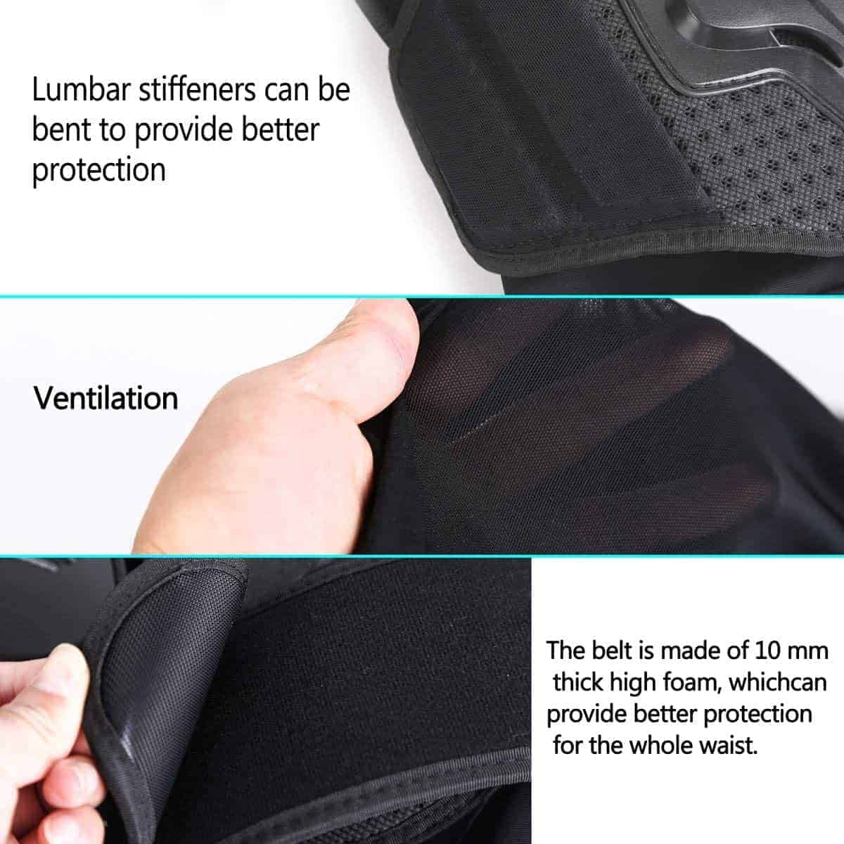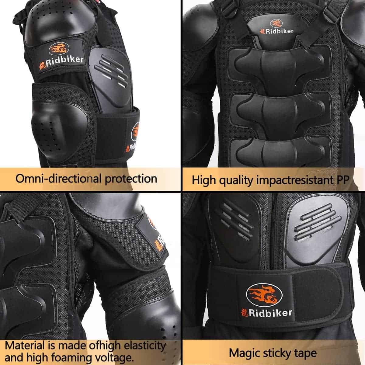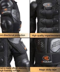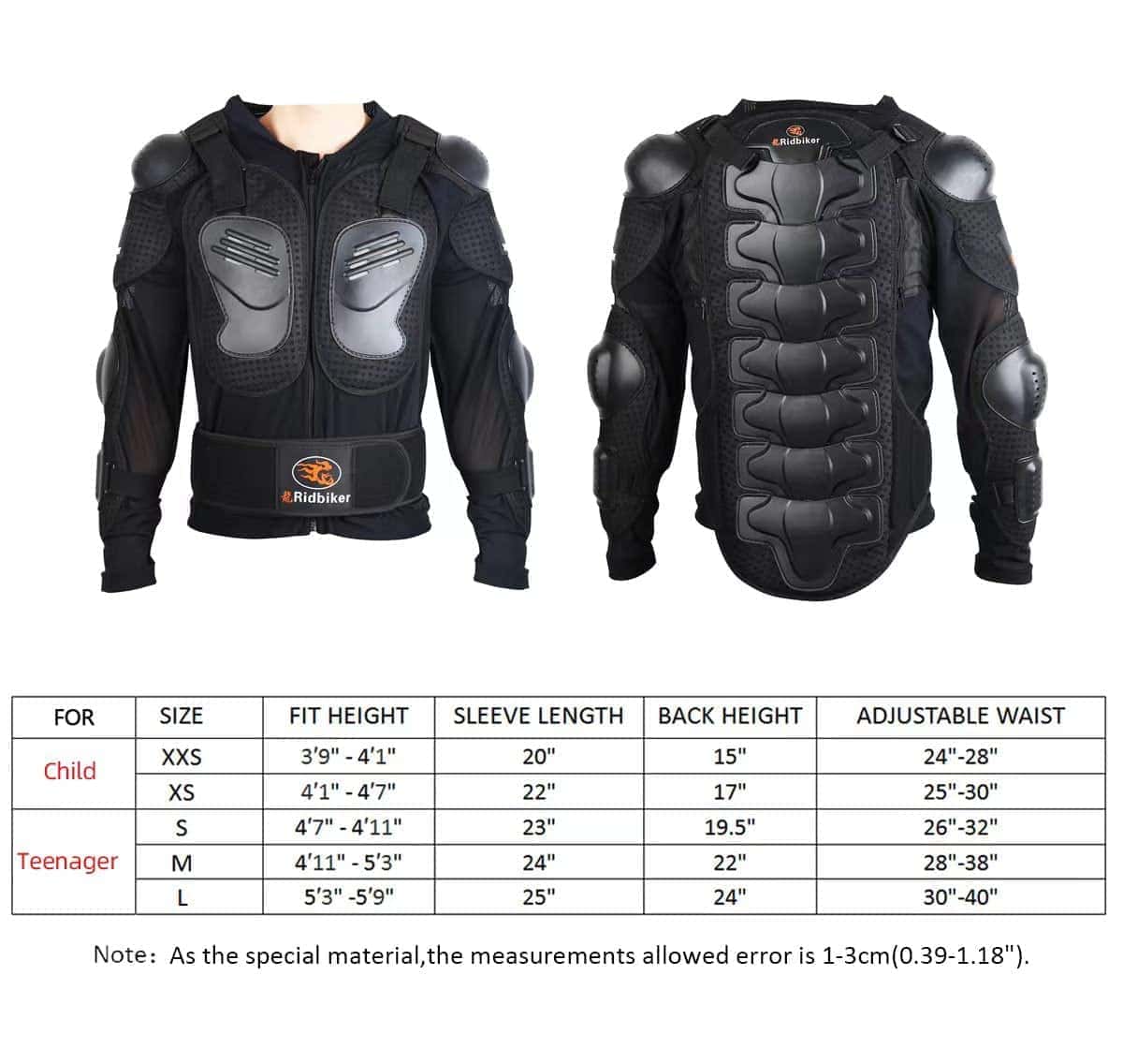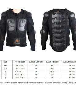 Tipo de Deporte: ciclismo, esquí, monopatín, motocross, y otros deportes al aire libre. Género: adolescente. Mantenimiento: limpieza en seco solamente. El paquete incluye: 1 chaqueta de cuerpo completo, 2 rodilleras. Nota: debido al tamaño de las chaquetas, la parte posterior de la chaqueta se verá diferente. Descripción: Sobre la chaqueta: -PP de alta calidad tiene una mayor resistencia al impacto, la carcasa de plástico está hecha de EVA perforado de 7 mm que es transpirable y proporciona protección contra impactos. -El material de algodón está hecho de una red de alta elasticidad, muy suave y cómodo de usar. Cremallera de alta calidad hecha por inyección y hay un paño antideslizante en el extremo de la cremallera para evitar que se salga la cremallera. -Puedes ajustar la chaqueta de armadura en el pecho, muñecas, cintura y espalda para un uso cómodo según tu demanda. -Los refuerzos lumbares pueden doblarse y el cinturón está hecho de espuma gruesa de 10 mm que puede rodear toda la cintura para brindar más protección. Sobre la rodillera: -El diseño del producto dividido en dos secciones puede ser móvil, siguiendo la flexión de tu rodilla. -La carcasa de plástico está hecha de PP de alta calidad, buena resistencia y fuerte resistencia al impacto. -El revestimiento de la carcasa de plástico está hecho de EVA elástico de 12 mm, suave y cómodo. Mejor absorción de impactos para proteger tu cuerpo. -Las correas se pueden ajustar infinitamente, se pueden ajustar a una posición cómoda según tus necesidades y no se resbalan fácilmente. -Longitud de la rodillera 14.56 pulgadas, mayor rango para proteger los muslos, rodillas y pantorrillas de los niños, cómodo de llevar. Tabla de tallas: TALLA altura adecuada longitud de mangas altura de la espalda cintura ajustable XXS 3’9″-4’1″ 20″ 15″ 24″-28″ XS 4’9″-4’7″ 22″ 17″ 25″-30″ S 4’7″-4’11» 23″ 19.5″ 26″-32″ M 4’11»-5’3″ 24″ 22″ 28″-38″ L 5’3″-5’9″ 25″ 24″ 30-40″