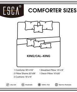 1. ¿Qué incluye el paquete: Edredón (104″ x 90″), 2 fundas de almohada (20″ x 36″), 2 cojines (16″ x 16″), 1 almohada para desayuno (12″ x 18″), y 1 almohada de decoración (9″ x 20″).