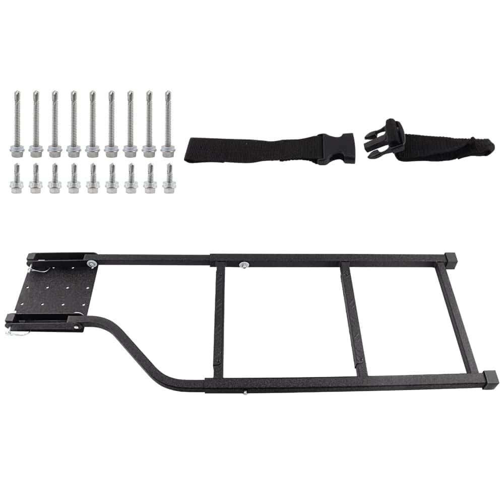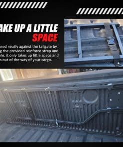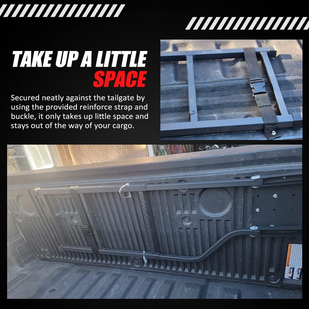 5. Diseño plegable: la escalera para la cama del camión se puede plegar y asegurar ordenadamente contra el portón trasero utilizando la correa de refuerzo y la hebilla proporcionadas, ocupa poco espacio y no interfiere con su carga.