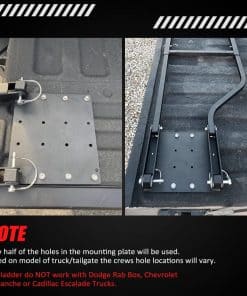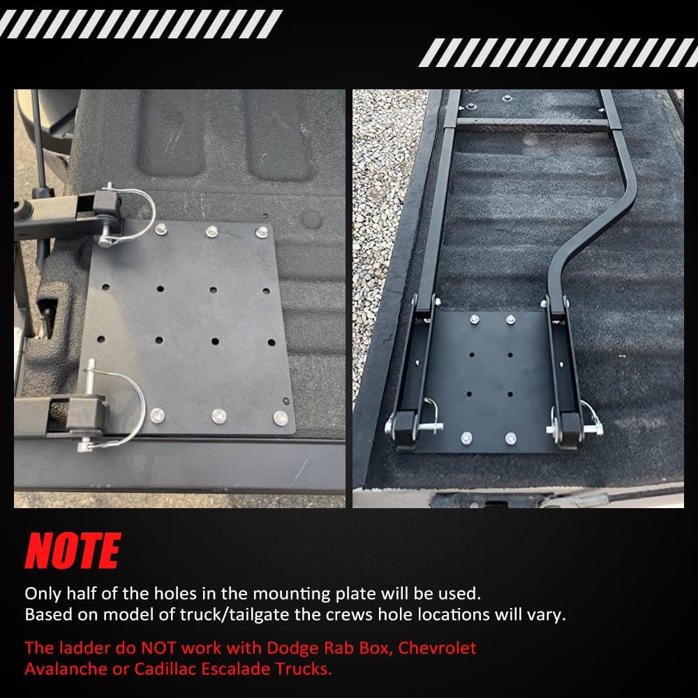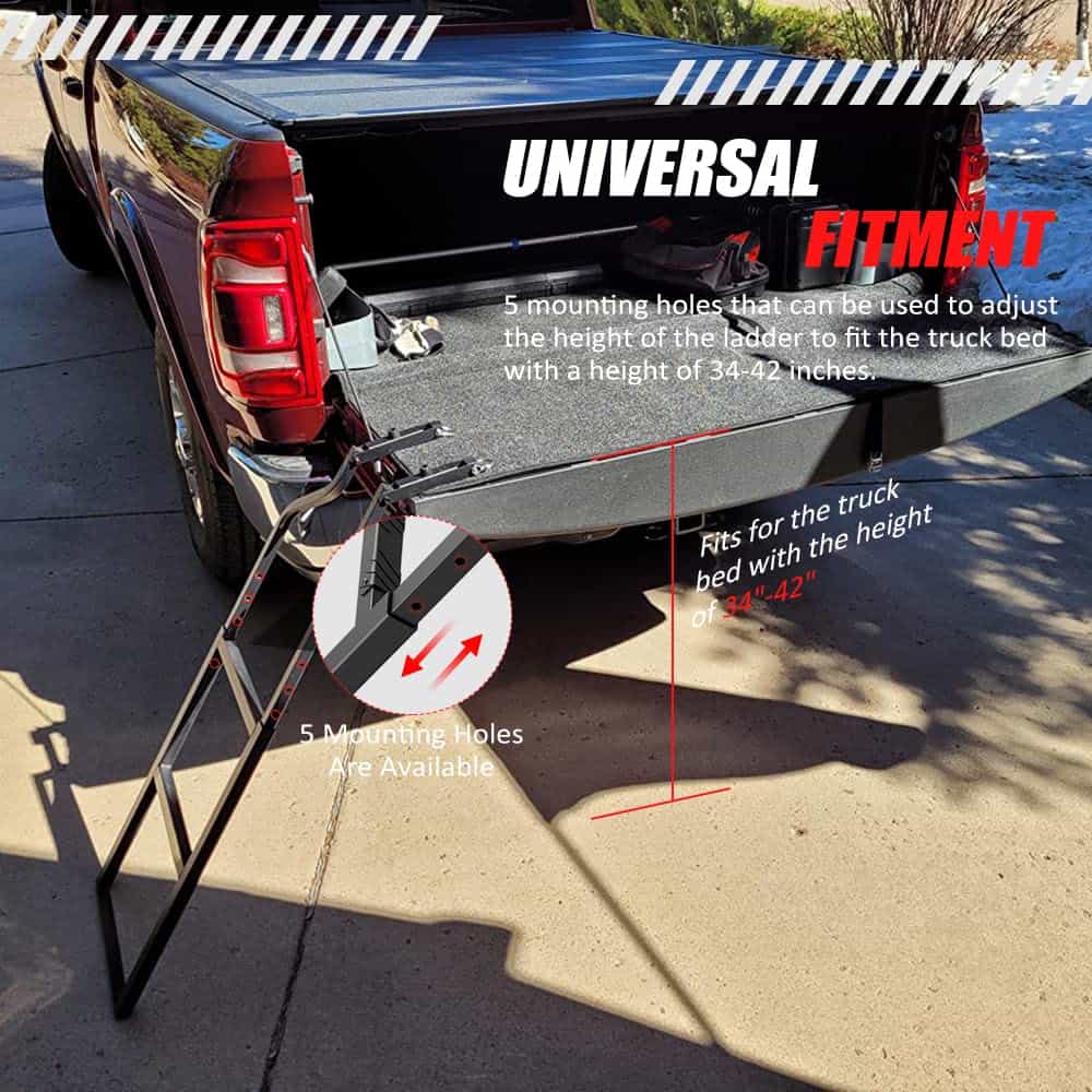 4. Disponible para camas de camión de diferentes alturas: la escalera para portón trasero del camión tiene 5 agujeros de montaje que se pueden utilizar para ajustar la altura de la escalera para que se adapte a la cama del camión con una altura de 34-42 pulgadas. (Nota: No funcionará con Dodge Rab Box, Chevrolet Avalanche o camionetas Cadillac Escalade).