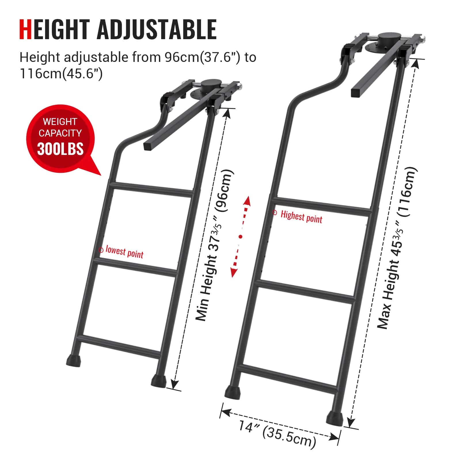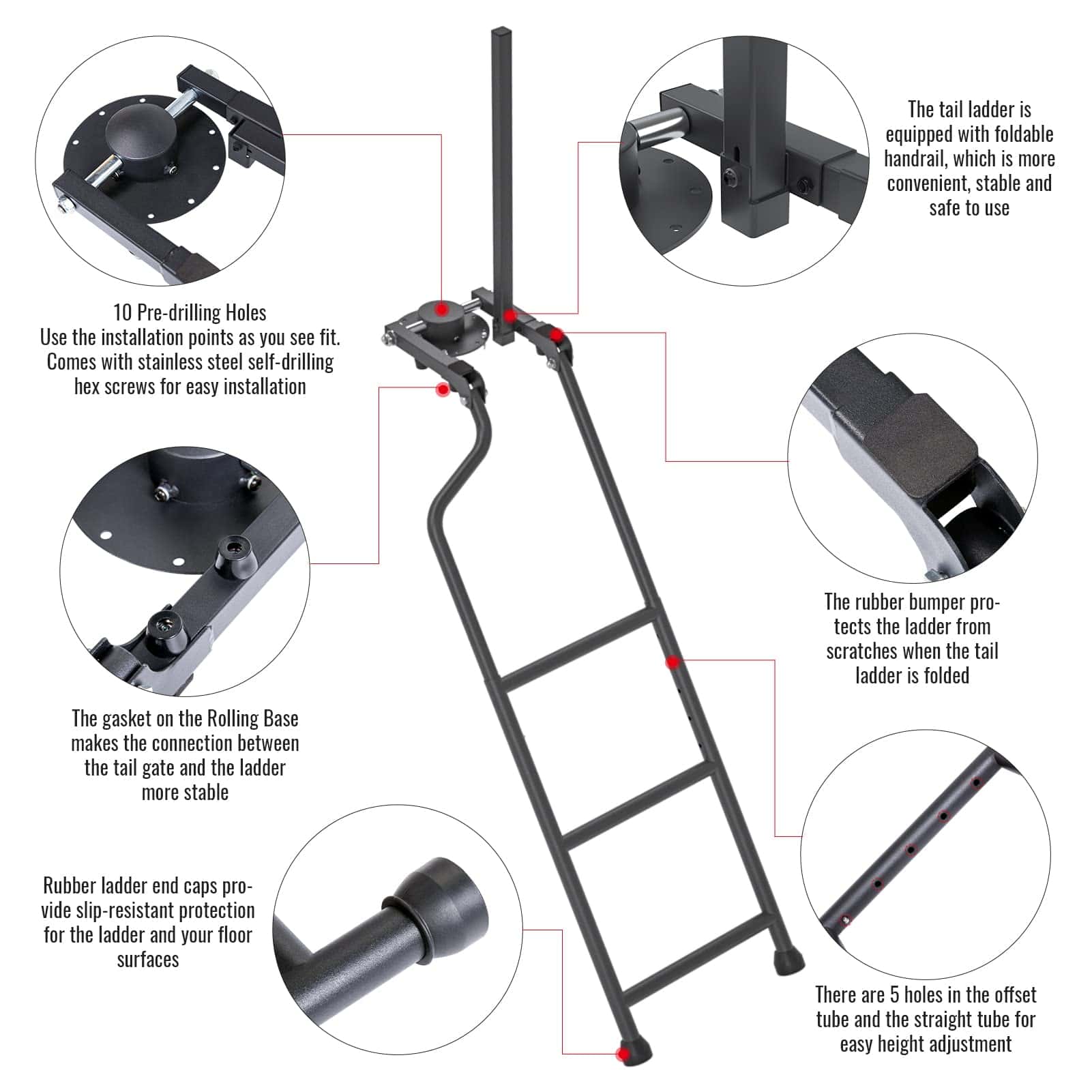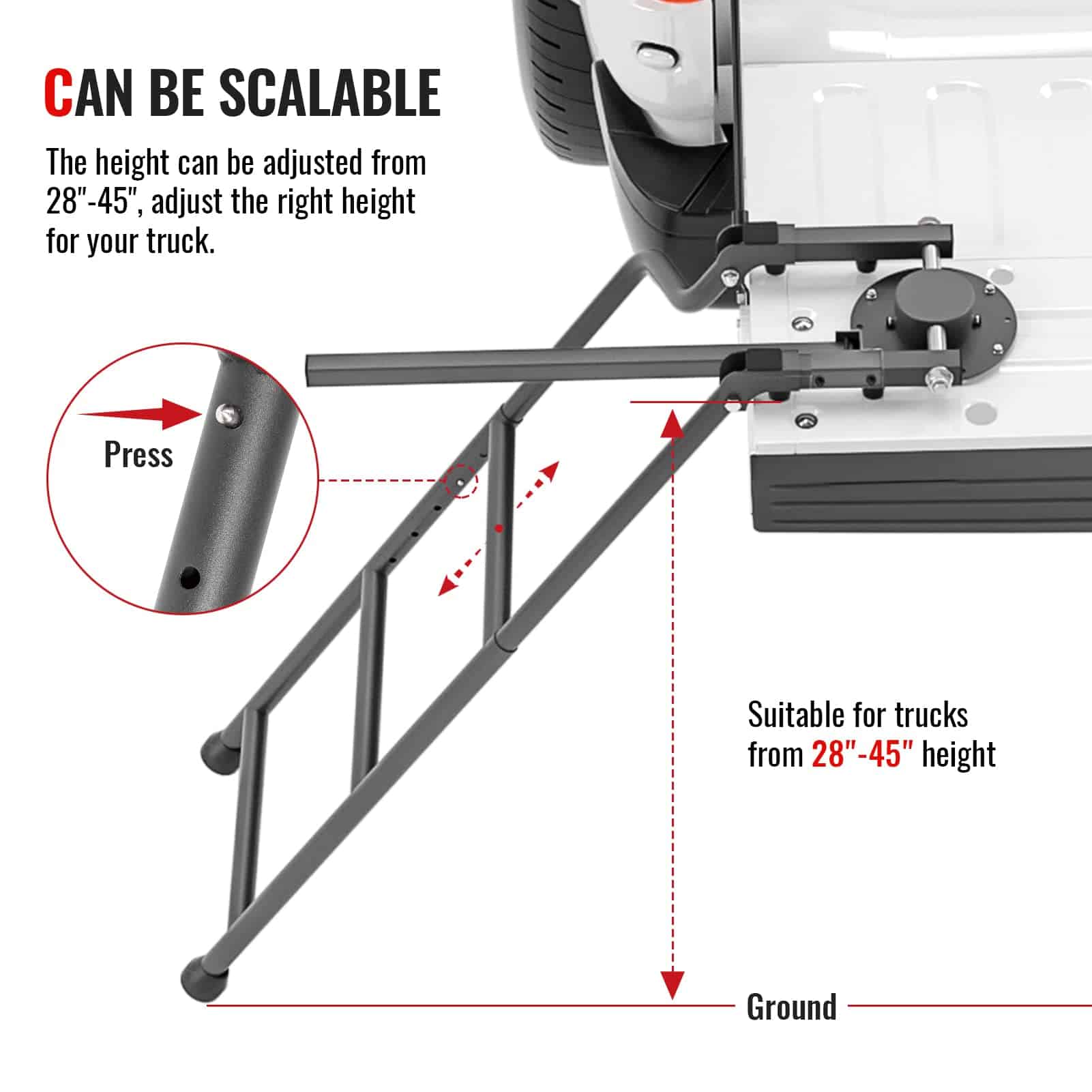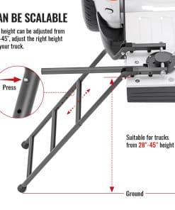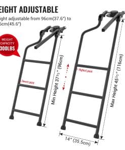 Características: Escalera de longitud ajustable puedes elegir la longitud dentro del límite más conveniente para que puedas obtener la mercancía. Refuerza el acero galvanizado y aplica un acabado de polvo negro para prevenir eficazmente el óxido, adecuado para cualquier entorno hostil. La escalera se puede plegar en la puerta trasera cuando no sea necesario y no ocupará espacio en el vehículo. Respecto al pasamanos, depende de ti instalarlo o desmontarlo según tus necesidades. La base utiliza un brazo basculante y una bomba de goma para conectar el deflector trasero con la escalera. Especificaciones: Volumen del paquete: 27,3 «x 15,3» x 2,8 «Material: Hierro y recubierto con polvo negro Color: Negro Carga máxima: 300 libras Peso: 13,2 libras