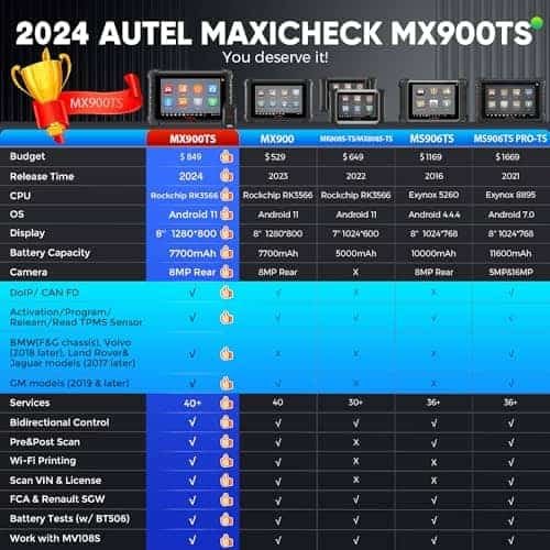 1. 2024 NUEVA VER. DE MK808S-TS MX808S-TS MK808Z-TS MK808TS Autel MX900TS ocupa el NO.1 en la industria de diagnóstico automotriz con su potente diagnóstico y TPMS completo. Comparado con los escáners antiguos, Autel MX900TS agrega CAN FD&DO IP Pantalla más grande de 8 pulgadas para detalles intuitivos Mayor capacidad de 7700mAh Cámara trasera de 8MP AUTO SCAN 2.0 Pre&Post Scan Escaneo VIN&Licencia WIFI Print. Además, hereda TPMS completo 40+ Servicios Prueba Bidireccional Todos los Sis Android 11.0 FCA y Renault SGW Trabaja con BT506/MV108S.