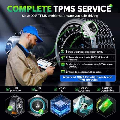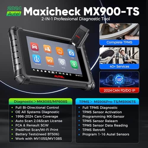 2. SERVICIO COMPLETO DE TPMS, IGUAL QUE MS906 PRO-TS A diferencia de Autel MX900/ MS906 PRO/ MP900/ MP808BT PRO que no admiten funciones TPMS, MX900-TS escáner TPMS igual que MS906 PRO-TS/ MK906 PRO-TS con el TPMS completo pero ahorra 720 B~UCKS. Se utiliza principalmente para verificar la salud del TPMS (lectura de presión/temporatura del neumático, ID del sensor, ubicación del sensor, condición de la batería, recuperar datos), activar el 99% de los sensores TPMS en el mercado, clonar y 2 formas de programar los Autel MX-Sensores, 3000+ procedimientos de reaprendizaje, retrofit de TPMS, etc.
