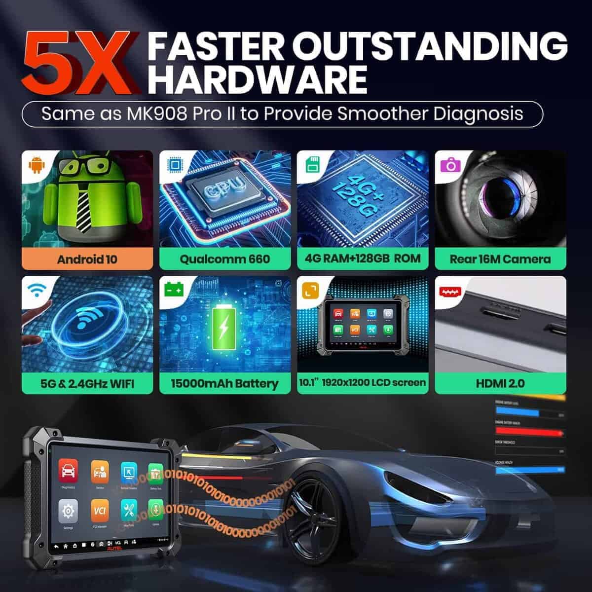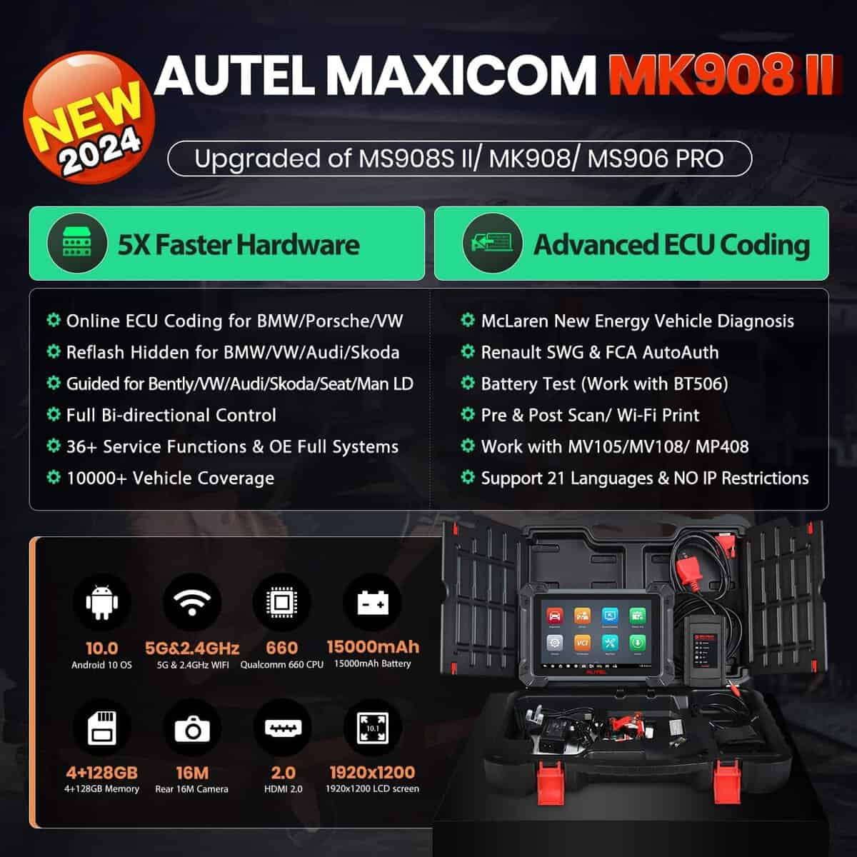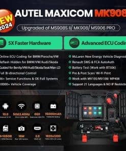 1. POR QUÉ DESTACA EL MK908 II DE LA COMPETENCIA 2024 Autel MK908 II, tanto el hardware como el software han sido mejorados enormemente. AutoScan 2.0: Cuenta con la última tecnología de Auto Scan en segundos, 3 veces más rápido que los competidores. GM/BMW con un tiempo de escaneo promedio de 8s, Chrysler/VAG/BMW/Ford 10s, Nissan/Toyota 20s, Honda 30s, Fiat/BENZ 40s, etc. La cobertura de modelos es líder en el mundo, el soporte más rápido para nuevos autos. BBA/GM/Toyota/Nissan/Honda ha sido soportado hasta 2024, 1 año antes que los competidores. 2. 2024 AUTEL MAXICOM MK908 II, ACTUALIZACIÓN DE MK908 El escáner Autel MK908 II mejorado de MS906BT/MS906 Pro cuenta con una mejor configuración: OS Android 10 5 veces más rápido Procesador Qualcomm SDM660 de 8 núcleos Mayor memoria de 4 GB+128 GB Cámara trasera de 16MP HDMI 2.0. Además, con Diagnósticos de Nueva Energía de McLaren Codificación Avanzada de ECU 38+ Servicios Pruebas activas Diagnóstico Completo OE Auto Scan 2.0 FCA&Renault SGW Funciona con MV108(S) Pruebas de batería (necesita BT506) Escaneo Pre-Post e Impresión Wi-Fi Funciona con MP408. 3. CODIFICACIÓN AVANZADA DE ECU IGUAL QUE MK908 PRO II/ MaxiSys Elite 2 La herramienta de diagnóstico Autel MaxiCOM MK908 II con codificación avanzada de ECU se utiliza para reprogramar los módulos de control del vehículo, puede obtener datos directamente del servidor y escribirlos directamente en la ECU sin necesidad de entrada manual. También se puede reprogramar datos adaptativos para ciertos componentes después de hacer reparaciones o reemplazos. MK908P II puede programar ECUs solo en algunos vehículos Benz y BMW, es demasiado caro para otras marcas. MK908 II te ahorrará $500. 4. REFRESCA FUNCIONES OCULTAS Y GUIADAS 2.0 ¿Quieres mejorar el rendimiento de tu vehículo El escáner automotriz Autel MaxiCOM MK908 II puede trabajar en VW/Audi/ koda/ Seat/ Man LD/ Bentley para desbloquear funciones ocultas como abrir el elevador de ventanas de un solo clic, plegar el espejo para ayudarte a mejorar el rendimiento del auto. Las funciones guiadas proporcionan instrucciones paso a paso, muestran requisitos de prueba, herramientas necesarias y consejos de advertencia para ayudarte a terminar tu trabajo más fácilmente, compatible con VW/Audi/koda/Seat. 5. 38+ FUNCIONES DE SERVICIO Mejorado de Autel MS908/MS906BT/MS906 PRO, la herramienta de diagnóstico Autel MK908 II cubre 38+ servicios como Restablecimiento de Aceite, Calibración de EPB, Calibración de SAS, Regeneración de D-P-F, Registro de Batería, Restablecimiento de mando a distancia, Sangrado de ABS, Codificación de Inyectores, Llave Fob, Adaptación de Transmisión, Calibración de Suspensión, Calibración de Punto Cero, Calibración de Sensores de Peso, Equilibrio de Potencia, Aprendizaje de Variación del Cigüeñal, etc. NOTA: ¡NO es universalmente compatible! Por favor envía el VIN a Autelonline @ outlook. com para verificar la compatibilidad. 6. ALCANCE DE TRABAJO DE 210 PIES Y CONTROL BIDIRECCIONAL Autel MK908 II soporta comunicaciones BT (alcance de trabajo de hasta 210 pies) y USB. El escáner de control bidireccional de Autel MK908 II con pruebas activas que pueden funcionar en el 99% de los vehículos en el mercado. Las funciones de control bidireccional pueden mejorar la eficiencia de diagnóstico en un 90%. Puede activar pruebas para controlar el motor ABS, la ventana, la puerta, la bomba de combustible, el embrague del a/a, las fugas de emisiones, etc. para probar sus operaciones o localizar rápidamente los problemas y solucionarlos. 7. DIAGNÓSTICOS DE TODOS LOS MÓDULOS DE NIVEL OE La herramienta de diagnóstico profesional Autel MK908 II puede acceder y diagnosticar todos los módulos disponibles (PCM, ECM, EPS, PDM, TPM, BCM, ABS, etc.) en más de 80 marcas y modelos domésticos, europeos y asiáticos hasta 2024. Con capacidades completas para códigos, datos en vivo, pruebas activas, información de ECU, coincidencia, etc., la herramienta de Auto Scan Autel MK908 II puede leer y borrar códigos de falla diagnosticados (DTCs), mostrar el flujo de datos en vivo de múltiples sensores y realizar pruebas activas específicas del vehículo. 8. FCA AUTOAUTH & AUTEL CLOUD MK908 II puede acceder completamente a los vehículos FCA protegidos, ¡no es necesario comprar el adaptador 12+8! MaxiCOM MK908 II es compatible con autos de FCA del 2017 en adelante (Chrysler, Dodge, Jeep, Alfa Romeo, Fiat, etc.) para realizar diagnósticos completos de sistemas, control bidireccional, codificación de ECU y mucho más. La función de gestión de informes en la nube puede cargar datos o informes de diagnóstico a la Nube Autel sin miedo a pérdidas. Es más fácil compartir informes a través de correo electrónico/SMS/código QR, sin límite de correo electrónico. 9. SIN LIMITACIONES DE IP & ACTUALIZACIONES DE SOFTWARE GRATUITAS POR 12 MESES La herramienta de escaneo de autos Autel MK908 II no tiene restricciones de IP y viene con 12 meses de actualizaciones de software GRATUITAS, con una frecuencia de actualización más alta (cada mes), puedes llevarla a otros países para hacer crecer tu negocio. Está respaldado por una política de REEMPLAZO NUEVO & REEMBOLSO COMPLETO de 30 días y viene con 1 (una) garantía de 1 año. NOTA: Después de que expire el período gratuito de un año, aún puedes usar el último software actualizado para trabajar en tu auto.