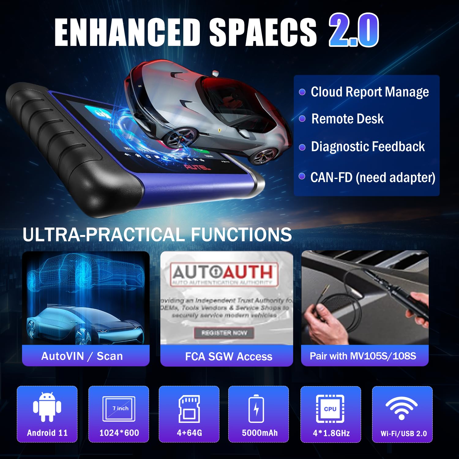 6. Hardware Mejorado Autel ha actualizado el MaxiIM IM508 a IM508S con hardware y software, lo que lo hace 5 veces más rápido y más inteligente: Android 11.0 fluido; Procesador Quad-core 1.8GHz 5 veces más rápido; Mayor 4G+64GB para una ejecución rápida y almacenamiento de datos; WiFi 5G&2.4GHz para actualizaciones eficientes; El conveniente AutoScan escanea automáticamente todas las ECUs del vehículo y detecta cualquier código de falla.