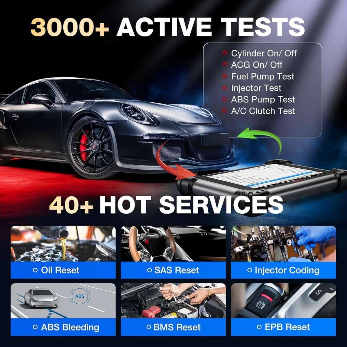 6. 40+ Servicios & Diagnóstico de Todos los Módulos a Nivel de OE, 150+ Marcas El Escáner automotriz Elite 2 PRO ofrece 40+ reinicios y servicios, como Reset de Aceite, Sangrado de Frenos, EPB, SAS, BMS, Acelerador, Codificación de Inyectores, Aprendizaje de Cigüeñal, Prueba de Balance de Potencia, etc. También puede realizar diagnósticos a nivel OE en todos los módulos de vehículos disponibles para leer y borrar DTCs. Los servicios son específicos para automóviles, por favor revise la compatibilidad antes de ordenar.