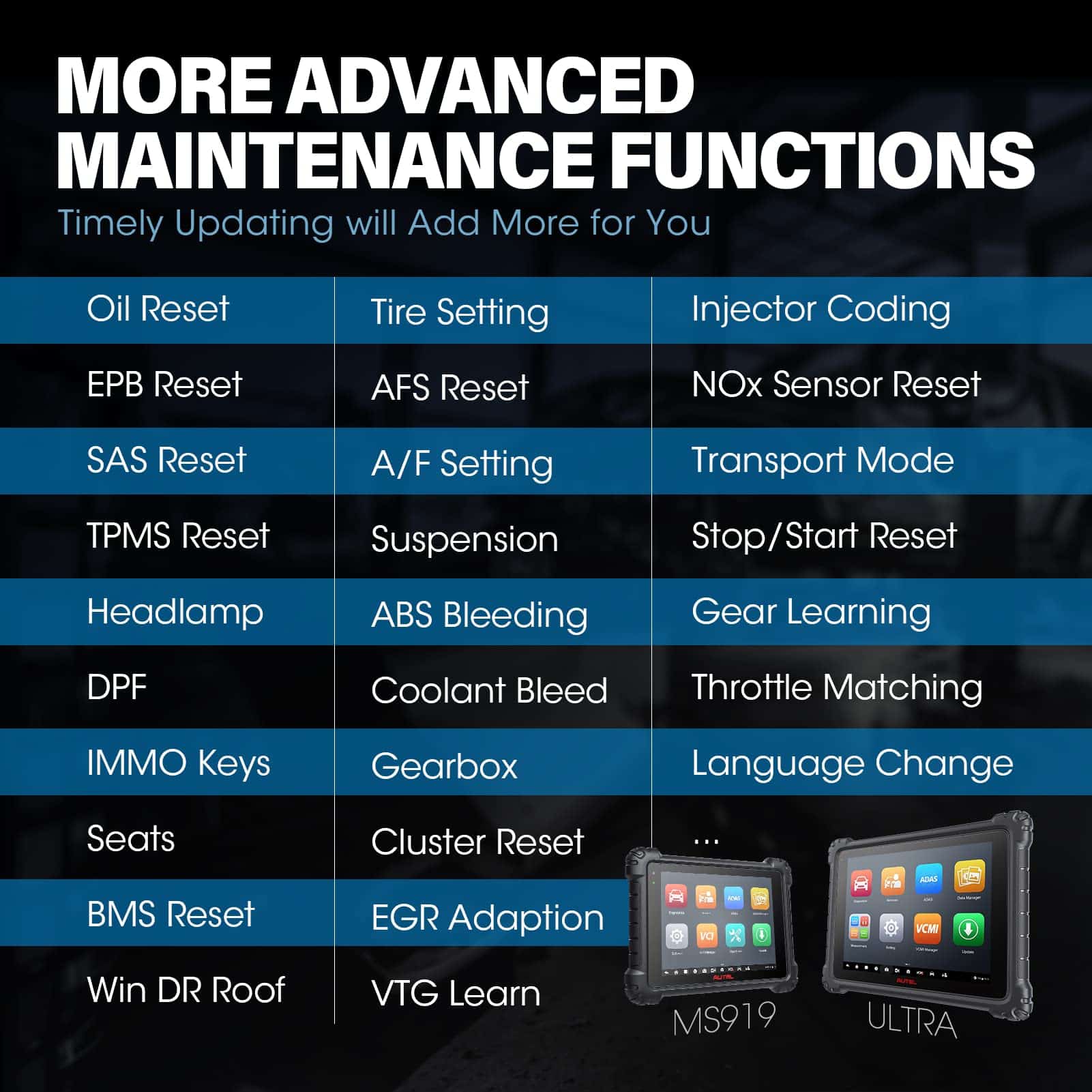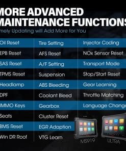 El escáner Autel MaxiSys MS919 es igual al MS Ultra pero más económico que la nueva versión de MS909 Elite, lo que lo convierte en la opción más rentable. Equipado con VCMI 5 en 1, Diagnósticos Inteligentes, Programación y Codificación de ECU, Mapeo de Topología 2.0 y más de 40 servicios adicionales, este escáner ofrece un diagnóstico inteligente para ayudar a solucionar problemas de manera eficiente. Además, cuenta con un VCMI 5 en 1 excelente que funciona como Multímetro, Osciloscopio, Generador de Formas de Onda y Probador de CAN BUS, lo que permite acceder a más datos. Con una pantalla táctil brillante de 10 pulgadas, memoria de 128GB y batería sostenible de 8 horas, el MS919 es la herramienta de diagnóstico ideal para talleres de reparación grandes y medianos. Además, está diseñado específicamente para el mercado estadounidense y cuenta con una política de devolución de 30 días, actualizaciones gratuitas por un año y garantía de calidad por un año.