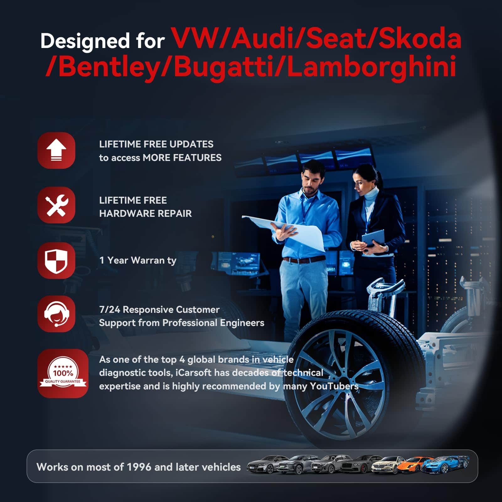 iCarsoft VAWS V3.0 es una herramienta de escaneo bidireccional mejorada diseñada específicamente para diagnósticos en profundidad de vehículos VW, Audi. Con capacidad mejorada de diagnóstico en profundidad, este escáner OBD2 es rico en funciones y ofrece un Control Bidireccional Potente, Diagnóstico de Sistemas Completos, Funciones OBD2 Completas de Fábrica, 42 Servicios de Reinicio Populares y muchas características más para brindarle un diagnóstico detallado y un fácil mantenimiento de su vehículo. Con la capacidad de enviar comandos a muchos componentes y sistemas para probar su estado de funcionamiento, esta herramienta de diagnóstico le permite realizar pruebas de actuación para diversos elementos, lo que ayuda a identificar áreas problemáticas con mayor facilidad. Además, cuenta con una variedad de servicios de reinicio populares, lo que le permite a su automóvil volver a funcionar correctamente después de cambiar componentes. Como una de las principales marcas mundiales en herramientas de diagnóstico de vehículos, iCarsoft es conocida por su experiencia técnica y es altamente recomendada por muchos YouTubers. Con actualizaciones de software de por vida, reparación de hardware gratuita de por vida y garantía de 1 año, puede confiar en la calidad y el respaldo de iCarsoft. Si tiene problemas de compatibilidad, se recomienda actualizar el software, ya que los concesionarios de automóviles suelen actualizar los sistemas de los vehículos. Además, el soporte técnico siempre está disponible para cualquier pregunta o asistencia que pueda necesitar.
