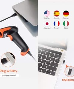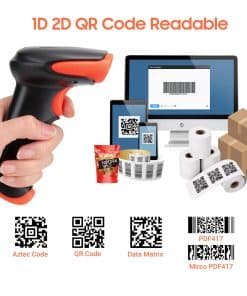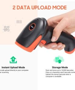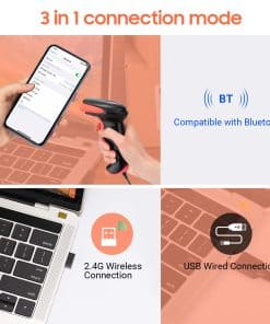 2. Transmisión Versátil 3 en 1 El escáner de código de barras Tera puede funcionar a través de conexión inalámbrica de 2.4GHz + USB 2.0 con cable. También es compatible con Bluetooth. Es compatible con Windows y Mac OS; funciona con Word, Excel, Novell; y casi todo el software común. Puede ser ampliamente utilizado en supermercados, centros comerciales, tiendas de cosméticos, industria minorista, industria postal, logística, bancos e instituciones médicas. 3. Batería Grande de 2000mAh, 60 Días de Espera Batería interna grande de 2000mAh, el tiempo de espera puede ser de más de 60 días. El tiempo de exploración continua puede ser de hasta 16.5-19.5 horas con carga completa. No te preocupes después de una carga. 4. Diseño a Prueba de Golpes de Silicona La cubierta protectora de silicona naranja brillante puede evitar arañazos y rozaduras al caer desde tu escritorio o estante. El uso del color naranja brillante también aumentará la visibilidad del escáner de códigos de barras cuando no lo uses o lo dejes en cualquier lugar. 5. Capacidad de Decodificación Simbologías: 1D: Codabar, Código 11, Code93, MSI, Código 128, UCC/EAN-128, Code 39, EAN-8, EAN-13, UPC-A, ISBN, Industrial 25, Interleaved 25, Estándar 25, Matriz 2D: QR, DataMatrix, PDF417, Aztec, Hanxin, Micro PDF417. Puede leer códigos de barras mostrados en teléfonos inteligentes y pantallas de computadoras.