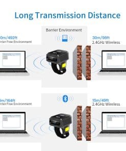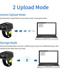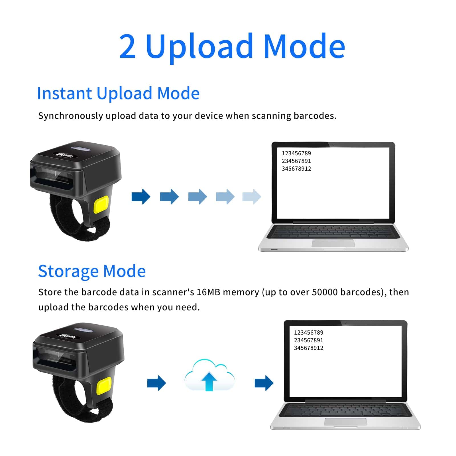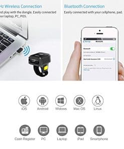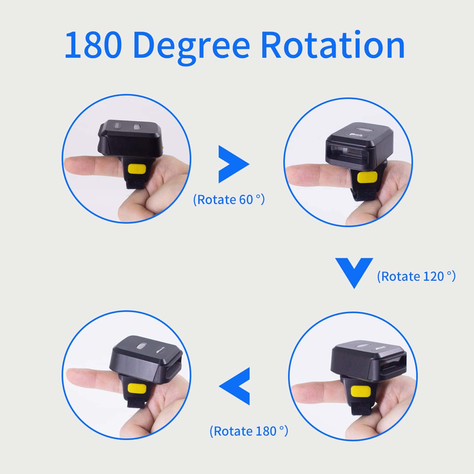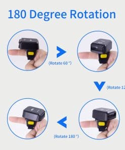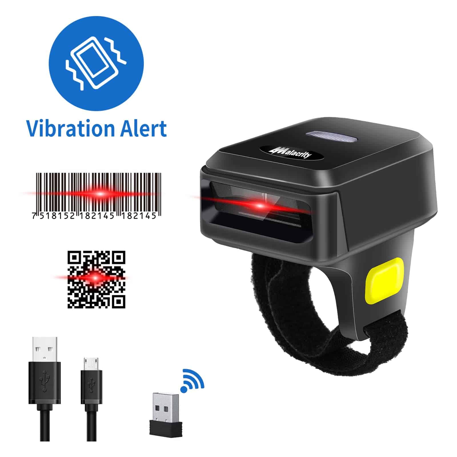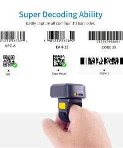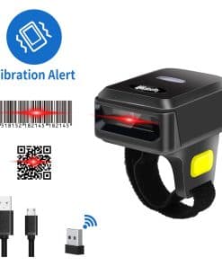 1. Escáner de Código de Barras 2D QR de Anillo – Diseño de escáner de anillo tan especial y portátil. Este mini escáner de código de barras 2D le permite usarlo en el dedo, izquierdo o derecho, botón de activación duradero, fácil de escanear con un solo clic ajustándose perfectamente en su dedo y cómodo de usar.
