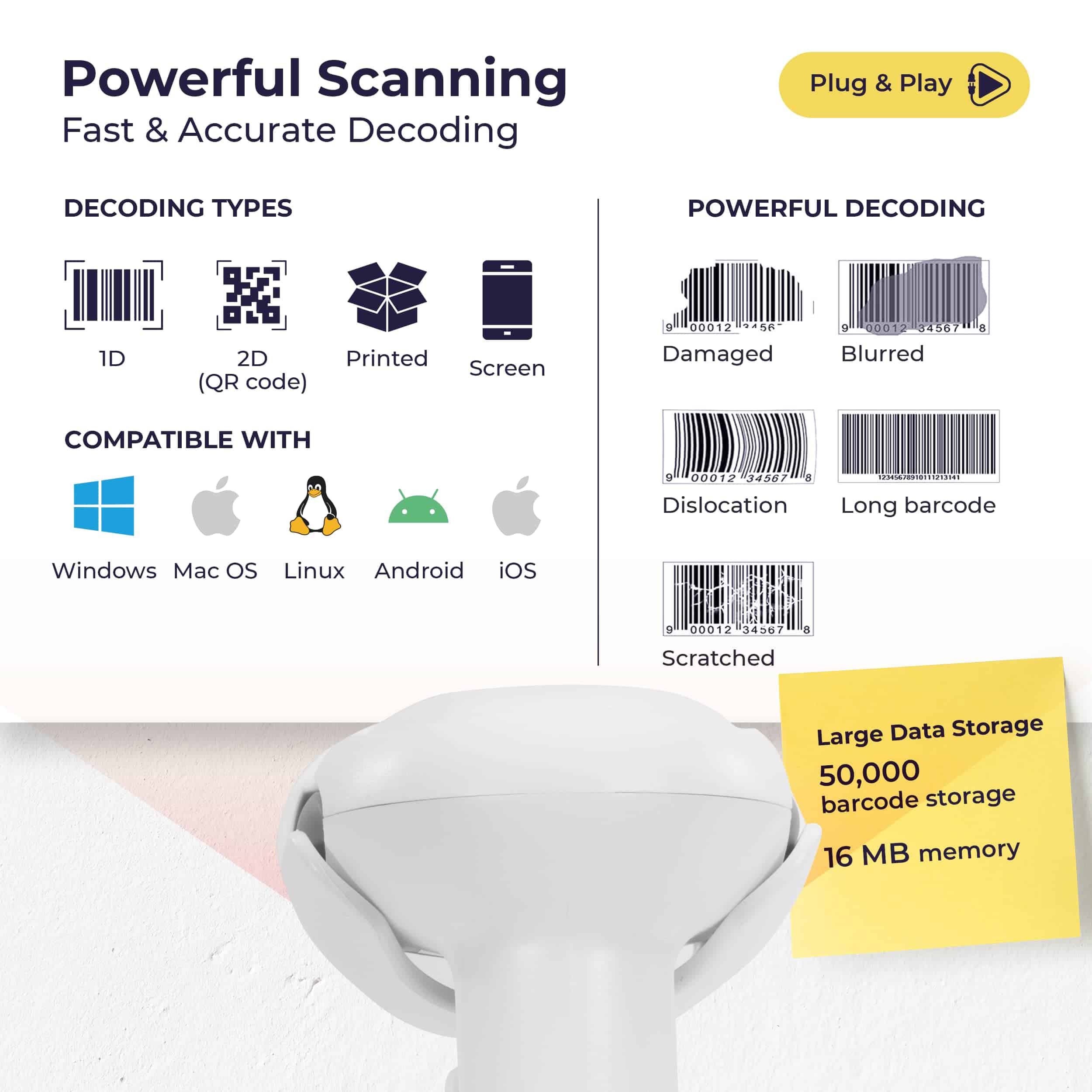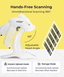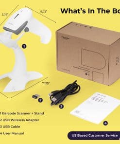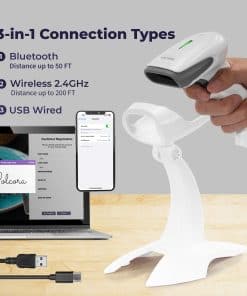 Escáner de código de barras inalámbrico Volcora, escáner de código QR, escáner portátil USB con soporte para conectar con tabletas, teléfonos y PC. Este escáner de inventario 1D & 2D es ideal para el comercio minorista y almacén. Simplifica la gestión de inventario con una fácil conectividad a múltiples sistemas. Con modos de carga e almacenamiento instantáneos, simplifica la recopilación de datos. Con 16 MB de memoria y almacenamiento interno de hasta 50,000 códigos de barras, es perfecto para cualquier negocio. Compatible con iOS, Android, Linux, Windows y MacOS, es una herramienta valiosa para cualquier sistema de gestión de inventario. Con opciones de conectividad versátiles, como USB, Bluetooth (distancia de transmisión de 49 pies) y 2.4G inalámbrico (distancia de transmisión de 328 pies), puedes conectarte fácilmente a una variedad de dispositivos como teléfonos inteligentes, tabletas y PC. Disfruta de una transmisión de datos fluida con nuestro versátil escáner de códigos de barras. Este escáner de alto rendimiento ofrece una velocidad de escaneo ultrarrápida, decodificando códigos de barras con precisión y facilidad, incluso si están borrosos, difusos, en movimiento o fragmentados. Su tecnología avanzada de detección automática y capacidad omnidireccional reconocen y escanean todos los principales 1D y 2D códigos de barras más 20 desde cualquier dirección, incluidos códigos QR, Data Matrix, PDF417, lo que lo convierte en una elección ideal para el comercio minorista, logística y gestión de inventarios. El escáner cuenta con carga rápida, tardando solo 4 horas en cargarse por completo, y puede estar en espera hasta 30 días o usarse continuamente hasta 24 horas (5 segundos/escaneo). Admite hasta 24 idiomas, como inglés, español, alemán, italiano, japonés y más. Este escáner también proporciona opciones de mayúsculas/minúsculas, prefijos o sufijos, caracteres ocultos, ajustes de volumen, ajustes de velocidad, etc. Nuestro equipo de servicio al cliente con sede en EE.UU. está disponible para ayudarte con cualquier problema de integración que puedas encontrar con el escáner de códigos de barras, asegurando que tengas una experiencia fluida y sin problemas. Además, todos los productos de Volcora están respaldados por una garantía, brindándote la tranquilidad de que tu inversión está protegida.