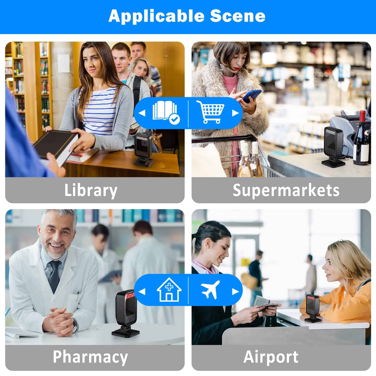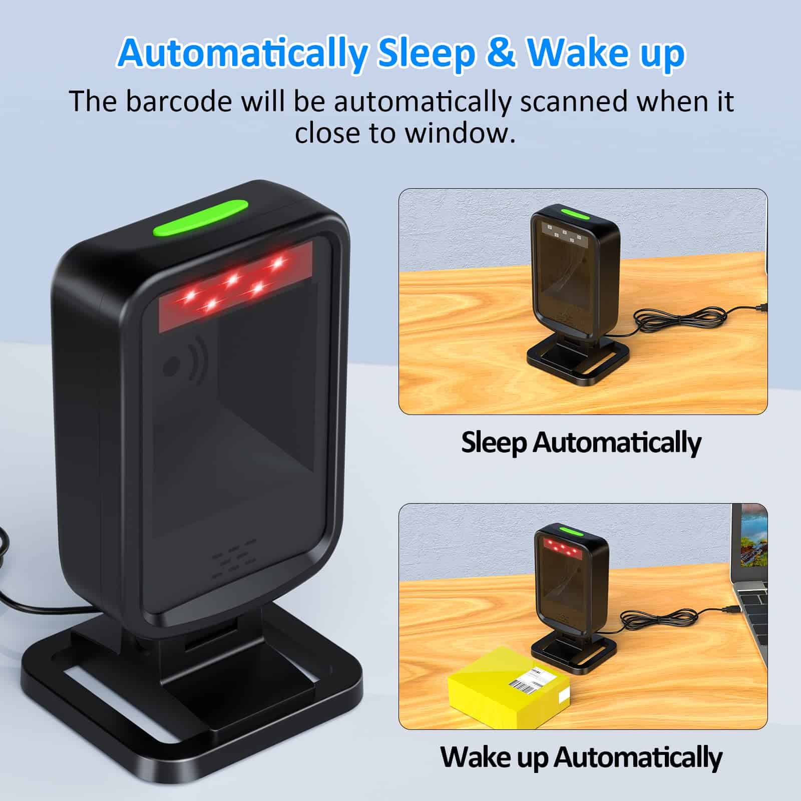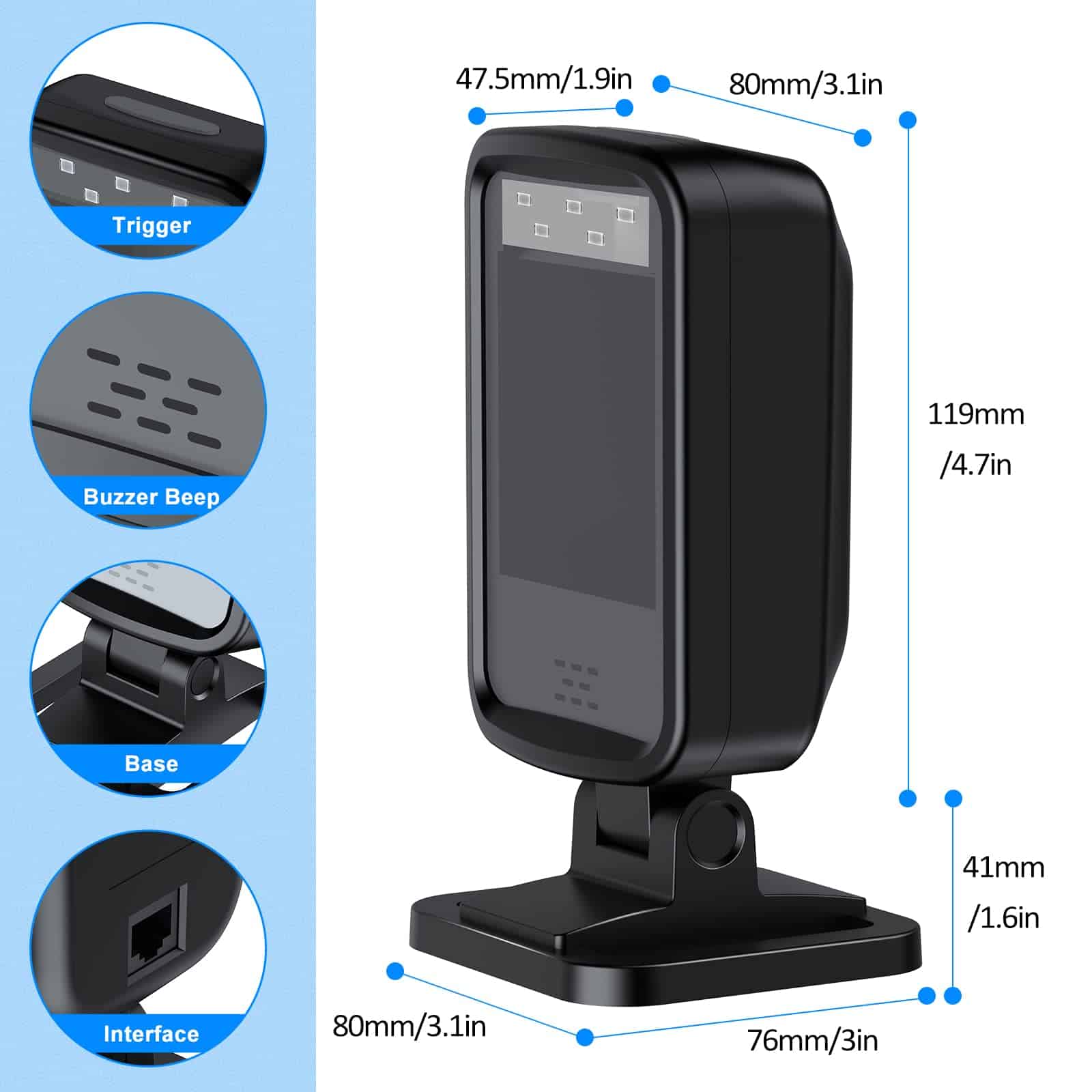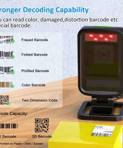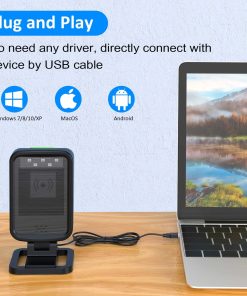 1. Escaneo Automático: El escáner de código de barras 1D/2D de Ganao puede capturar códigos 1D y 2D automáticamente, sin necesidad de presionar ningún botón, liberando las manos de los usuarios. 2. Plug and Play: El lector de códigos de barras de escritorio de Ganao cuenta con conexiones USB, plug and play, no es necesario instalar ningún controlador. Compatible con sistemas Mac, Windows, Android y Linux. Notas: Se requiere puerto USB. 3. Decodificar la mayoría de los tipos de códigos 1D y 2D: Código de Barras 1D: UPC-A, UPC-E, EAN-8, EAN-13, Code128, Code39, Code 39 Full ASCII, Codabar, Industrial 2 de 5, Interleaved 2 de 5, Code93, MSI, Code11, ISBN, ISSN, China Post, GS1 Databar, Code32, etc. Código de Barras 2D: Código QR, Matriz de Datos, PDF417, Código Azteca, Maxicode, etc. Puede leer tanto códigos normales como invertidos (código de barras blanco sobre fondo negro). 4. Ajuste de Ángulo de Escaneo de 45 Grados: El ángulo de escaneo puede ajustarse según el uso de escenarios o hábitos de usuario. 5. Mejorar la Eficiencia de los Usuarios: En comparación con un escáner de código de barras de mano, nuestro escáner de código de barras sin manos es más libre para sus manos, no es necesario levantar el escáner al escanear, ya sea un cajero escaneando productos o un cliente escaneando un código de barras digital desde un teléfono inteligente. Puede mejorar la eficiencia del trabajo y ahorrar tiempo. Además, es muy fácil de usar, no se necesita capacitación adicional para el personal nuevo.