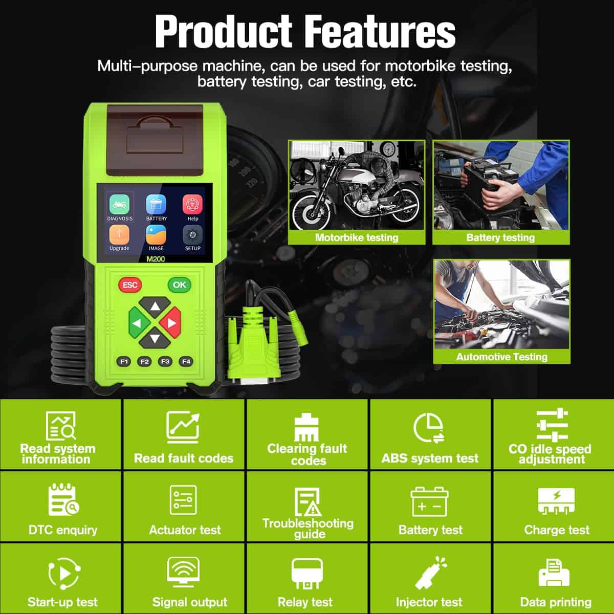 Escáner de Diagnóstico para Motocicletas TopDiag M200 2023 Herramienta de Lectura de Códigos de Falla de Batería Probador de Moto (Versión Estándar). Este versátil escáner de diagnóstico para motocicletas ofrece la posibilidad de realizar tanto diagnósticos de motocicletas como análisis de baterías. Con múltiples funciones, este dispositivo puede utilizarse para pruebas de motocicletas, pruebas de baterías, pruebas de automóviles, entre otros. El análisis de baterías cuenta con modos de prueba rápida, prueba estándar y prueba de arranque, lo que permite detectar diversos problemas de forma eficiente. Además, el escáner incluye un simulador de señales que puede replicar señales de cigüeñal, PWM, inyector y de encendido. Por otro lado, las pruebas de inyectores y la detección de señales facilitan la limpieza de los inyectores de combustible. ¡Hazte con este completo escáner de diagnóstico y mantén tus motocicletas en perfecto estado de funcionamiento!