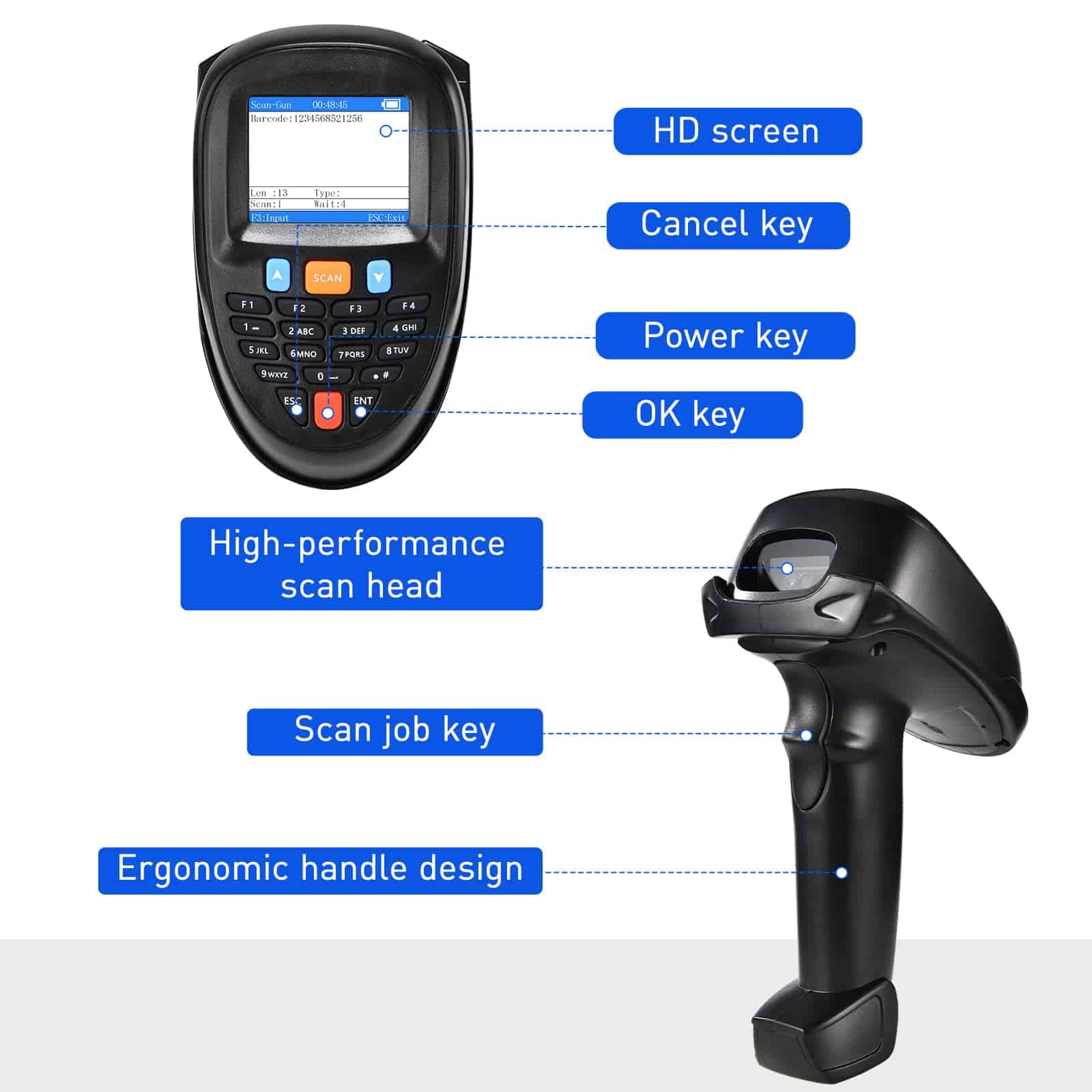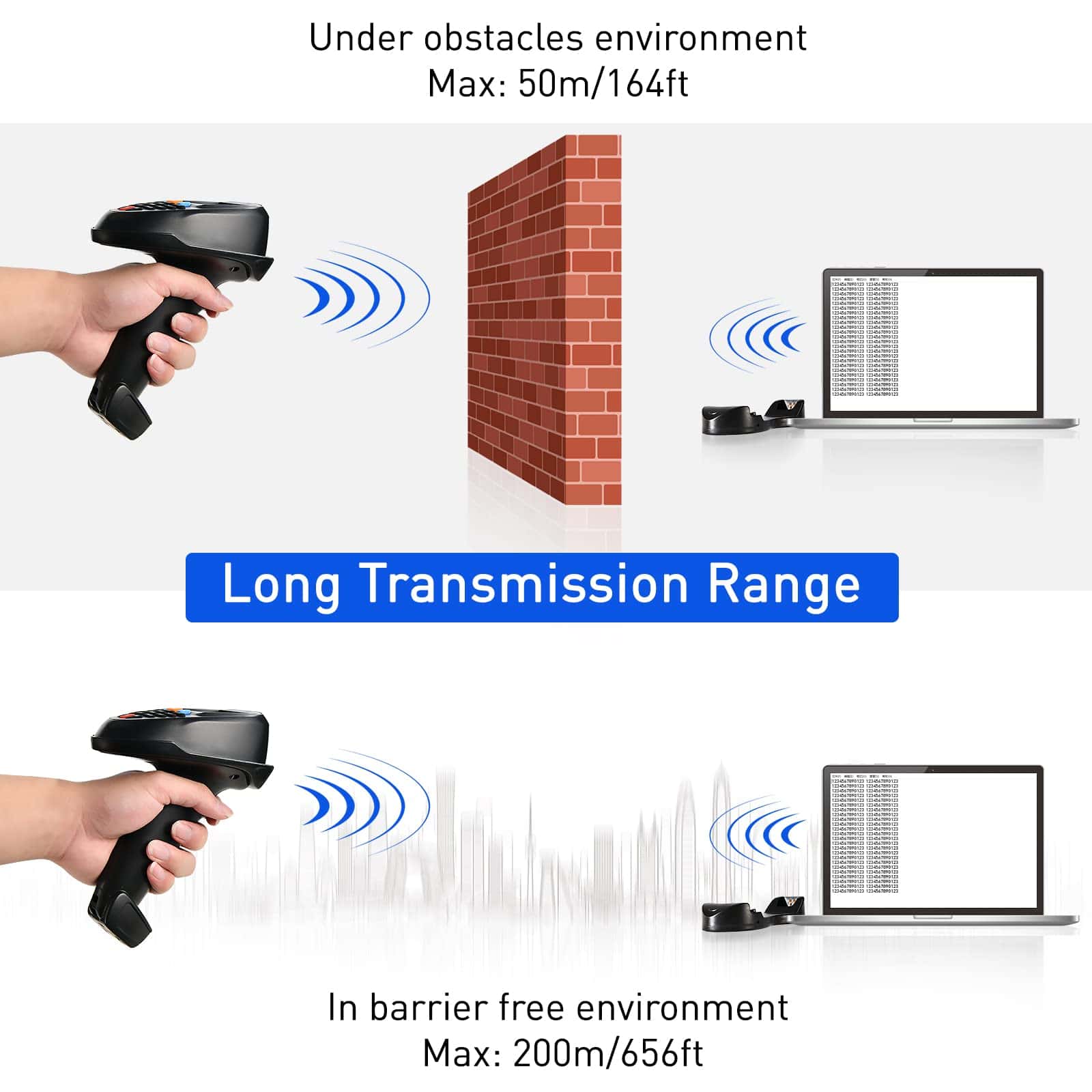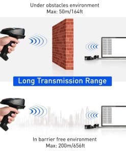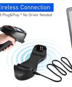 4. Batería de gran capacidad de 1400 mAh asegura 20 horas de escaneo continuo sin manos. Con una batería de 1400 mAh, puede funcionar durante 20 horas de escaneo continuo o escanear 100,000 veces. El plástico resistente asegura que el escáner pueda soportar caídas de hasta 5 pies / 1.5 m de altura. (Nota: Si le resulta difícil escanear códigos, contáctenos para resolverlo).