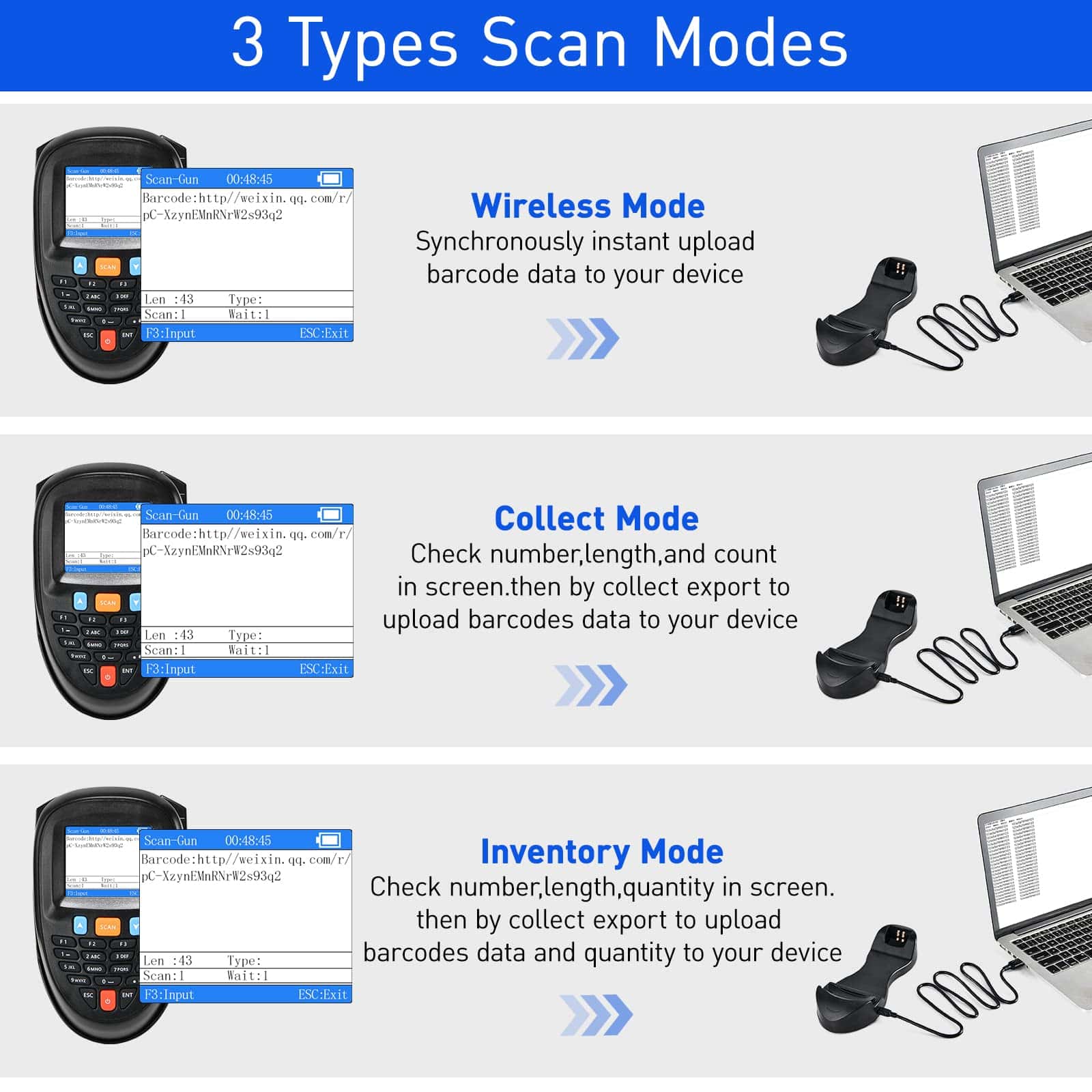 5. Función de recopilación adicional: La función de recolección está diseñada para circunstancias de códigos de barras no repetibles, puede elegir permitir o no el escaneo repetido presionando F2 para encender / apagar el código de barras único. Esta función es ideal para rastrear números, números de serie, números de material, ampliamente utilizados en la industria expresa, supermercado, minorista, farmacia, almacén y otros sectores.