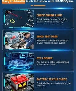 6. Amigable con el usuario y actualización gratuita: Conectar y listo. La herramienta de diagnóstico BAS300 Plus cuenta con un diseño ligero y portátil que facilita su transporte y almacenamiento. Tiene una interfaz de usuario fácil de entender y operar, y admite gráficos y texto en pantalla. Admite 10 idiomas: inglés, francés, español, alemán, ruso, italiano, portugués, finlandés, holandés, polaco. Admite actualizaciones gratuitas de por vida y funciones de retroalimentación.