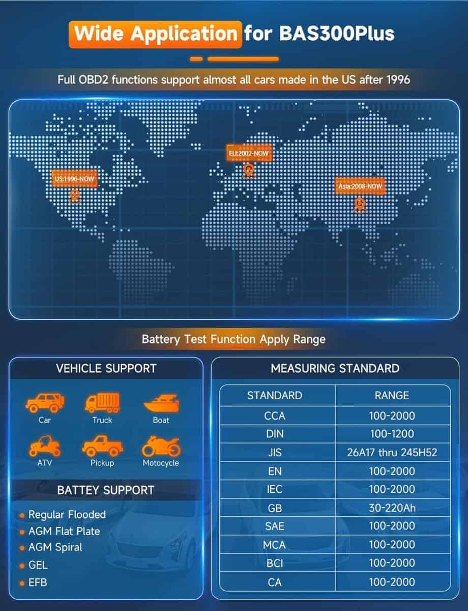 4. Amplia compatibilidad: Cuando funciona como lector de códigos OBDII, funciona en la mayoría de los vehículos vendidos en Estados Unidos con modelos posteriores a 1996, modelos de la UE de 2002 y modelos asiáticos de 2008. Cuando se utiliza como probador de batería, es adecuado para todas las baterías de 12v de 100 a 2000 CCA, como las convencionales de inmersión, AGM, GEL, EFB, etc. Adecuado para diferentes marcas y modelos de automóviles, camionetas, vehículos todo terreno, SUV, carros de golf, motocicletas y otras baterías.