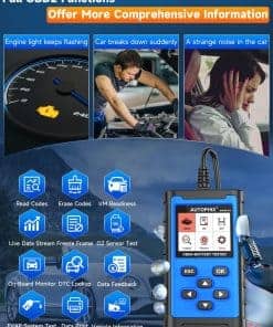 2. Función completa de diagnóstico OBD2: El escáner OBD2 AUTOPHIX BAS300 Plus puede leer códigos de problemas (DTC) rápidamente, verificar luces del motor (CEL) y borrar códigos de error del vehículo para solucionar problemas del motor. También puede leer flujos de datos en vivo, ver datos de marco congelados, mostrar resultados de pruebas de monitor a bordo, recuperar información del vehículo, las pruebas de monitor I/M preparadas y los lectores de códigos automotrices también pueden admitir pruebas de monitor O2 y pruebas de sistema Evap. Permite conocer la condición de los vehículos antes de la inspección anual.