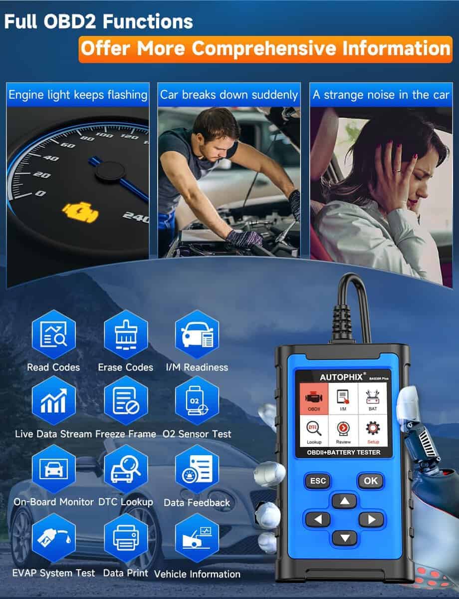 1. Ahorre $1000s en sus vehículos: ¿no ha estado al tanto de lo que está mal con su automóvil? ¿Está preocupado por ser sobrevalorado por la tienda de reparaciones sin saber el problema? En comparación con la mayoría de los escáneres OBD2 en el mercado que solo tienen la función OBD2, el Escáner AUTOPHIX BAS300 Plus está recientemente actualizado, combinando la función de diagnóstico OBD2 y la función de prueba de batería, admite diagnósticos de función OBD2 completos, así como pruebas de batería, pruebas de arranque y pruebas de carga. ¡Un escáner AUTOPHIX BAS300 Plus puede ahorrarle más tiempo y costos de reparación, haciendo su viaje en automóvil más conveniente y sin problemas!