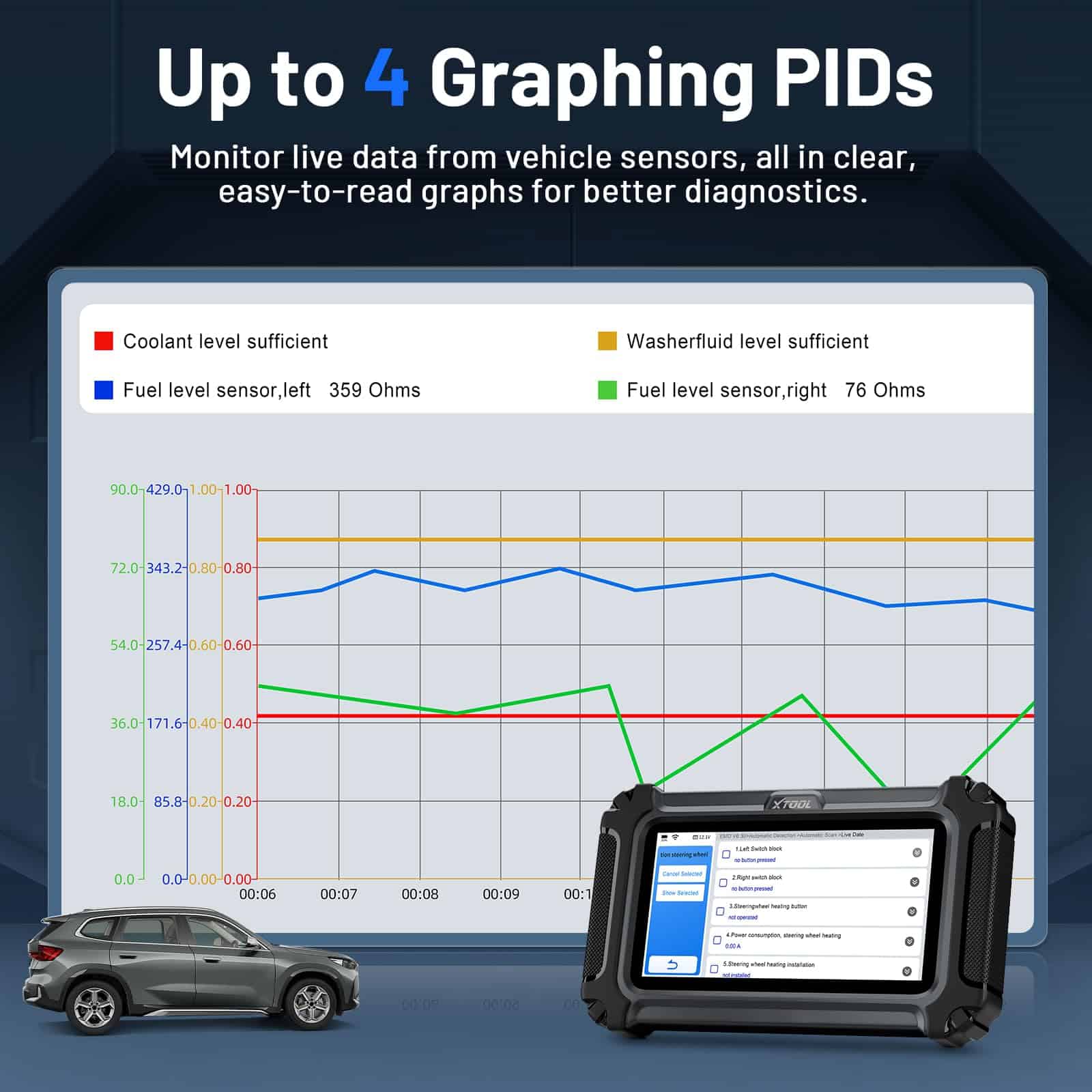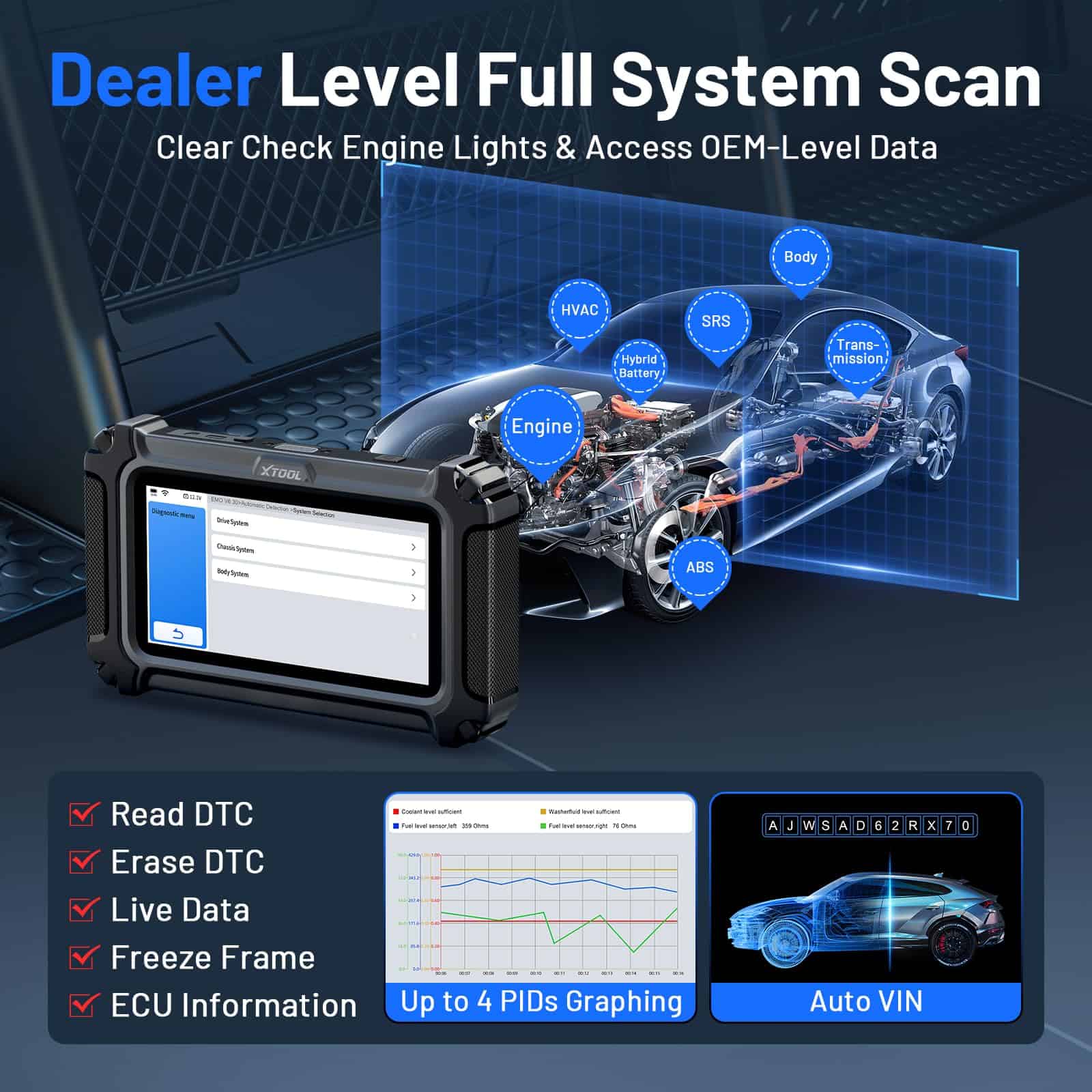 El escáner de autos D6S le permite acceder a todos los sistemas de su vehículo, incluyendo motor, transmisión, ABS, airbag y más. El escáner de autos D6S le permite leer y borrar códigos de falla de diagnóstico (DTCs), monitorear datos en vivo en tiempo real y mostrar hasta 4 gráficos de datos dinámicos simultáneamente. Desde verificar la luz del motor hasta realizar mantenimiento de rutina, el escáner de diagnóstico de autos D6S garantiza que su vehículo se mantenga en óptimas condiciones, ayudándole a evitar reparaciones costosas y el estrés de problemas repentinos e inconvenientes que pueden dejarlo varado. La herramienta de escaneo de vehículos D6S también incluye una característica de visualización de voltaje de batería, lo que le permite monitorear el sistema eléctrico de su vehículo en tiempo real. Esto garantiza que la batería y el sistema de carga de su vehículo funcionen correctamente, evitando problemas eléctricos que podrían llevar a fallas inesperadas del módulo. Con actualizaciones gratuitas a través de WiFi, siempre tendrá acceso a las últimas características sin tarifas de suscripción requeridas. La pantalla táctil de alta resolución de 5.45 pulgadas (1440×720) garantiza una visibilidad clara, incluso en condiciones de poca luz. El diseño duradero del D6S, que incluye agarres de silicona y cables reforzados, garantiza que esté construido para durar. El almacenamiento amplio de 32GB (ampliable) le permite guardar datos de diagnóstico, convirtiendo al D6 en una inversión rentable a largo plazo. La herramienta de escaneo para autos XTOOL D6S funciona con vehículos equipados con OBDII fabricados después de 1996, incluyendo motores diésel de 12V, SUV, minivans y camionetas ligeras. Compatible con la mayoría de los protocolos, incluido CAN FD, cubre más de 90 marcas de vehículos. Con sus capacidades de diagnóstico OBD2, el escáner obd2 D6S ayuda a resolver problemas comunes como la Luz de Verificación del Motor (CEL), problemas del sistema de emisiones, problemas de eficiencia de combustible y fallas en sensores como sensores MAF, MAP o de temperatura del refrigerante. Agilice su flujo de trabajo con la tecnología AutoVIN, que identifica automáticamente el VIN de su vehículo para diagnósticos más rápidos. El escáner de autos D6S también cuenta con una biblioteca de DTC integrada para ayudarlo a interpretar los códigos de falla fácilmente. Guarde y comparta informes de diagnóstico para realizar un seguimiento del rendimiento de su vehículo. El soporte FCA AutoAuth y el protocolo CAN FD garantizan la transmisión de datos a alta velocidad, lo que lo hace compatible con vehículos modernos. La calidad XTOOL de confianza y el soporte técnico continuo garantizan que el escáner de diagnóstico de autos D6S sea una herramienta confiable y de alto rendimiento que se adapta a sus necesidades.