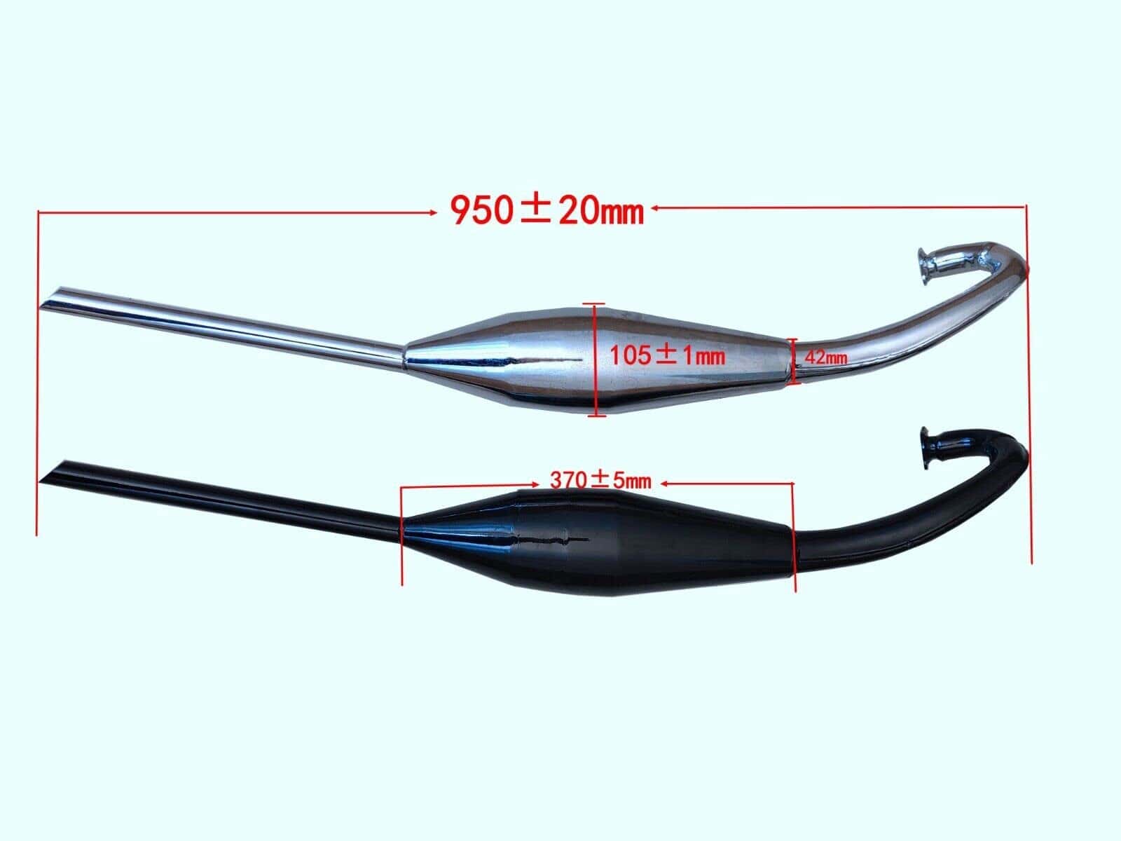 Escape de cámara de expansión CDH88 de CDHPOWER para bicicleta motorizada a gas de 2 tiempos. Este escape tiene un espaciado de pernos de 1.56 pulgadas/40mm que se ajusta a la mayoría de los kits de motor a gas de 2 tiempos de 48cc/66cc/80cc/100cc. La longitud de la cámara es de 37 0.5cm, el ancho es de 105 1mm y la longitud total es de 950 20mm. Tenga en cuenta que puede haber rasguños en la superficie debido al proceso de fabricación. Este escape es ideal para mejorar el rendimiento de su bicicleta motorizada a gas.