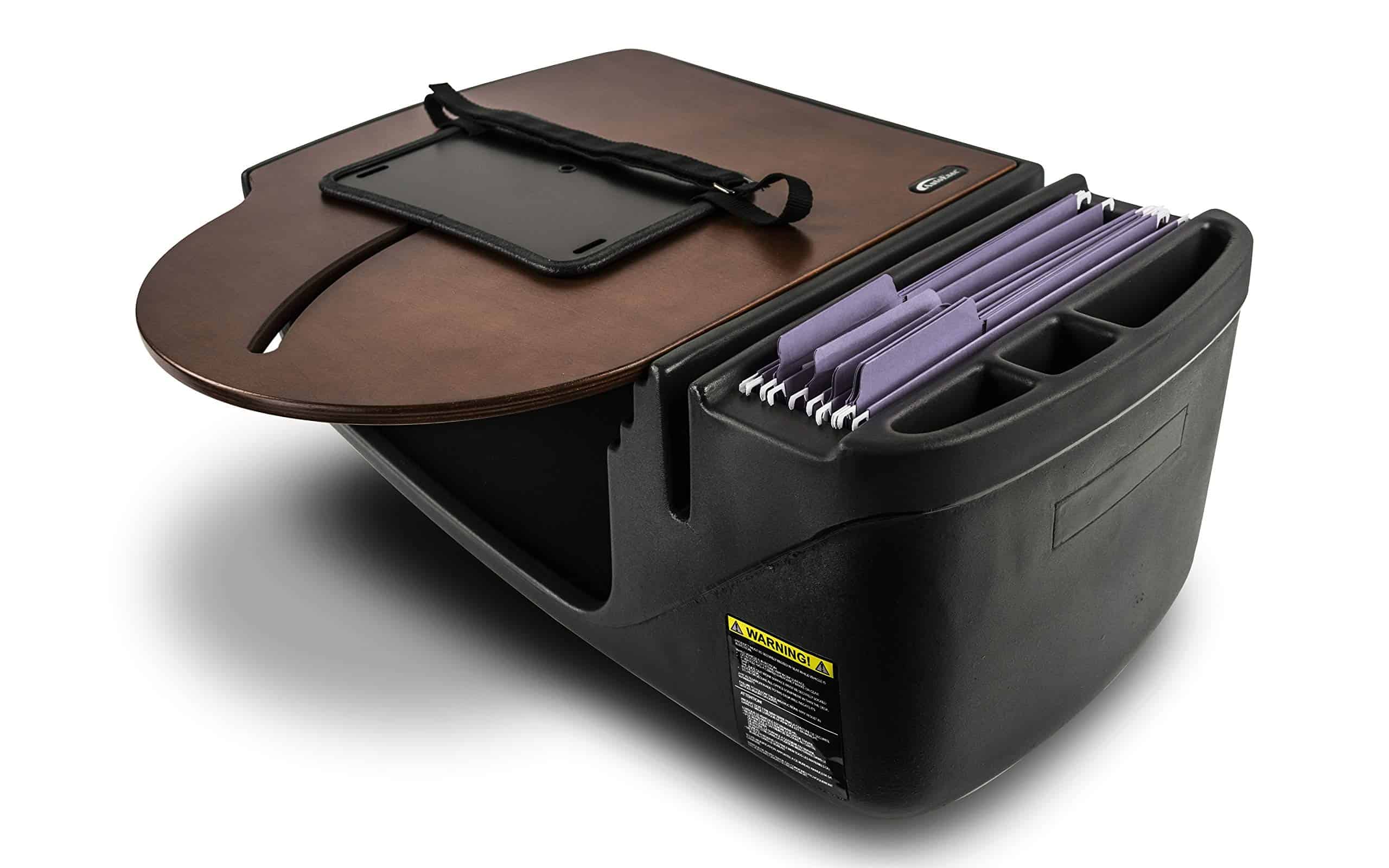 AutoExec realmente ha ayudado a colocar la computadora portátil en una posición que es fácil de usar y escribir. El Roadmaster es una de las soluciones más ergonómicas disponibles hoy en día. La parte superior de 21″ de ancho tiene una placa para computadora portátil ajustable para que la computadora portátil se pueda mover a una posición cómoda para escribir. La placa para computadora portátil se extiende más allá del borde del escritorio por otras 3 pulgadas, lo que la convierte en un alcance total de 24″ desde el borde lejano del escritorio. Junto con las características de comodidad de este producto, puedes disfrutar de espacio para archivos colgantes y un área de almacenamiento oculta. Esto te ayudará a mantener objetos de valor fuera de la vista y asegurarte de que estés organizado. Sujeta el escritorio con el cinturón de seguridad de tu vehículo. Sujeta la computadora portátil a la placa usando la correa de velcro incluida. Se adapta a la mayoría de los automóviles más pequeños, SUV y mini-vans.