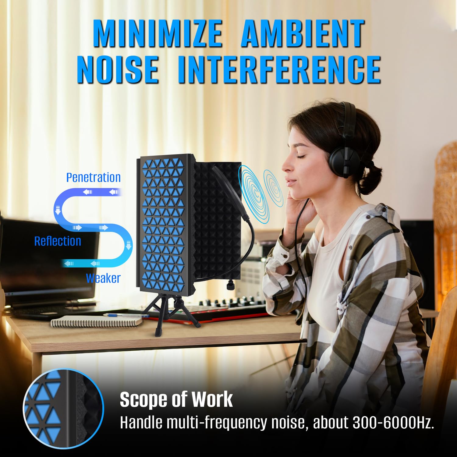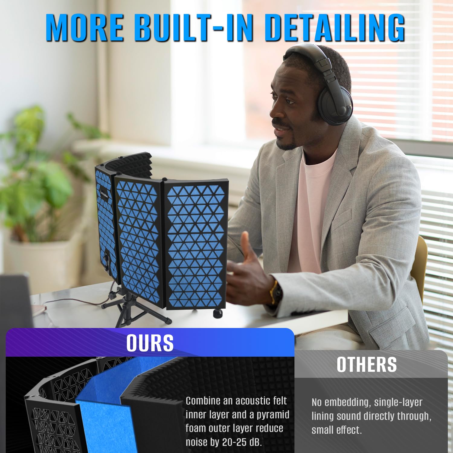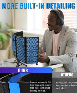 1. Detalles de Precisión Fabricado con un panel de fieltro de alta densidad de 2,4 mm, diseñado para minimizar el ruido ambiental y la interferencia de reflexión. La interacción entre el fieltro y la espuma ofrece una calidad de audio excepcional para estudios de grabación, estableciendo un nuevo estándar para el aislamiento de sonido.