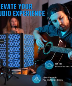 2. Elegante Acabado Metálico Plegable Fabricado con metal duradero para una estabilidad incomparable, nuestro elegante escudo de espuma para micrófono se extiende a una anchura completa de 23 pulgadas. Su curvatura ajustable ofrece versatilidad para un almacenamiento fácil o para configurar un entorno de estudio más íntimo.