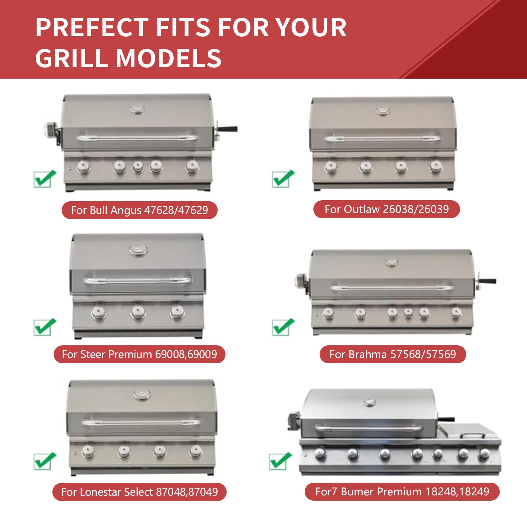 1. Escudos térmicos para parrillas Bull: Modelos 18248 LP, 18249 NG, LP 47628, NG 47629, 57569 NG, 57568 LP, LP 62648, NG 62649. Reemplazo para Angus 47628,47629, Brahma 57568, 57569, Outlaw 26038, 26039, Steer Premium 69008, 69009, Lonestar Select 87048, 87049, 7 Burner Premium 18248, 18249.