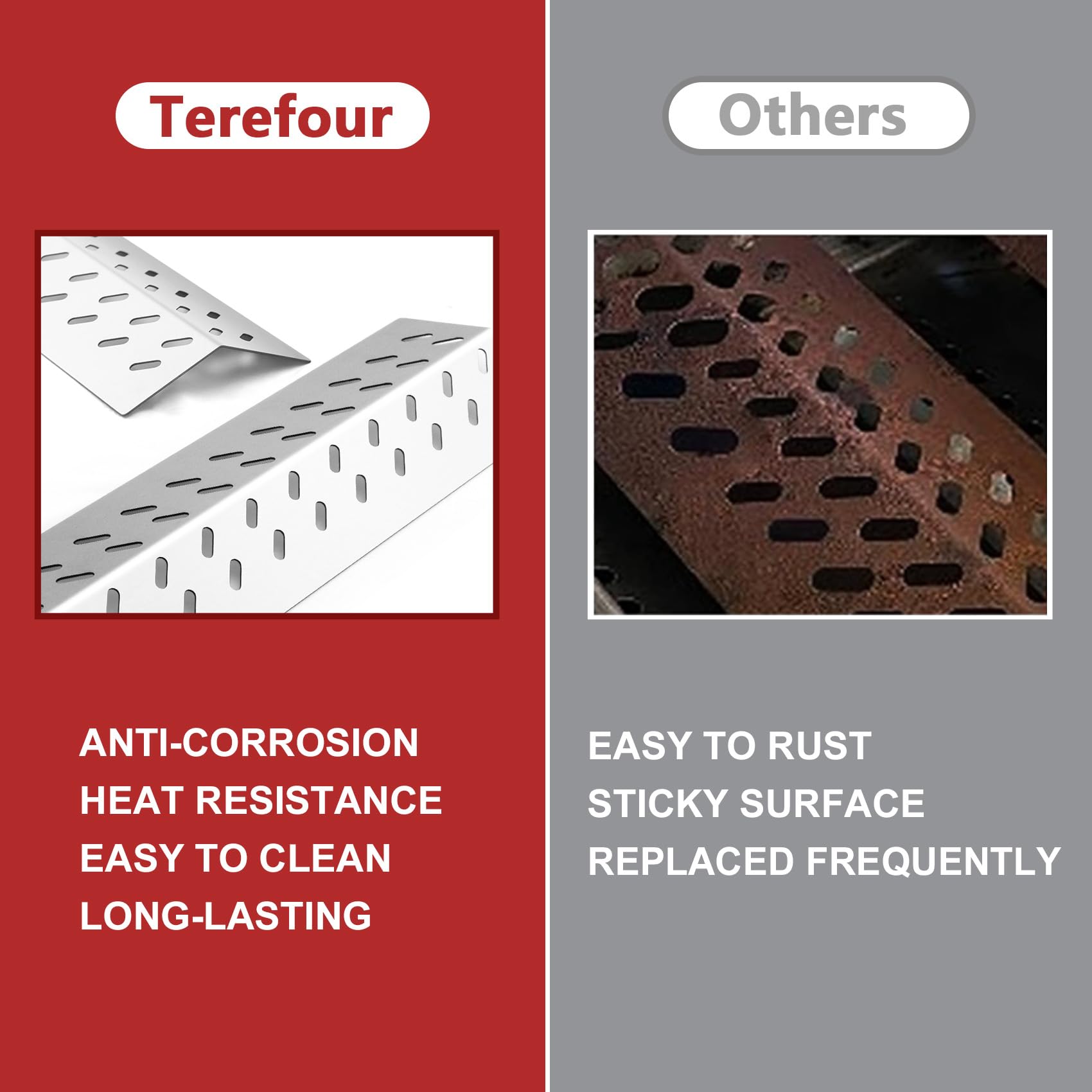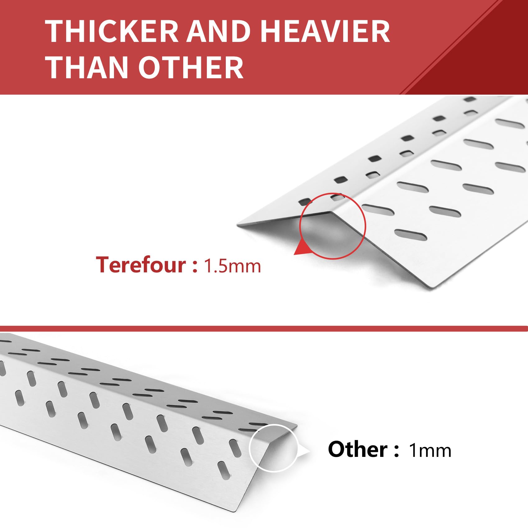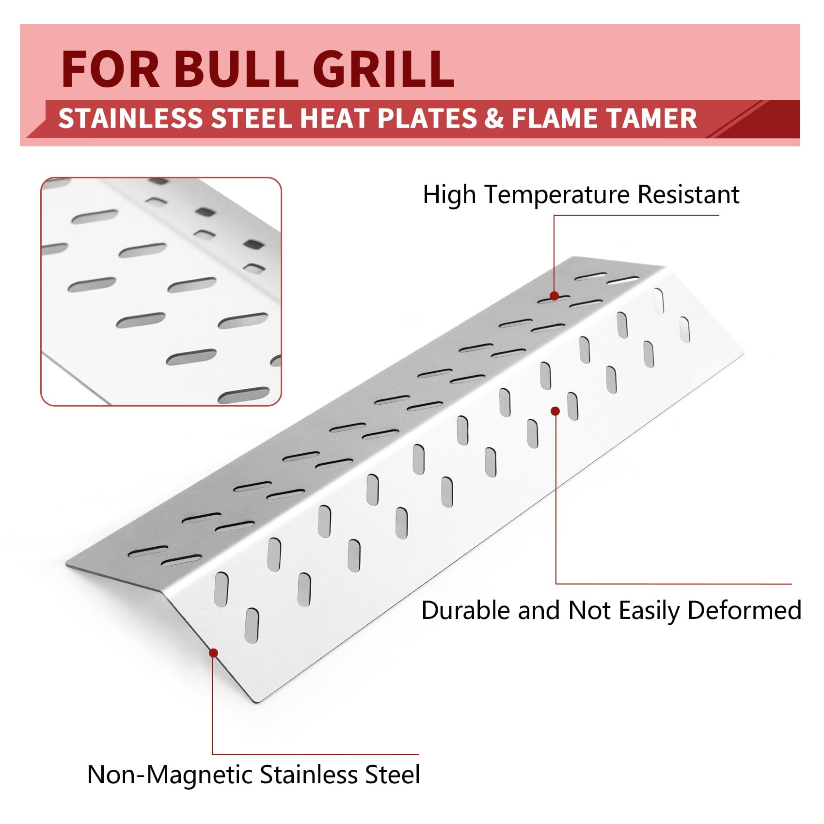 3. Más grueso es Mejor: Las piezas de repuesto para parrillas Bull están hechas de acero inoxidable de alta resistencia, el grosor es de 1.5 mm (16GA), más grueso y pesado que otros escudos térmicos para parrillas Bull. Cocina mejor, Dura más tiempo.
