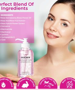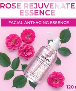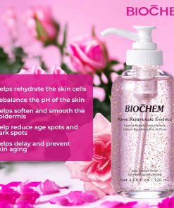 Esencia rejuvenecedora de rosas BIOCHEM – 4.06 fl oz / 120 ml: Esta esencia facial antienvejecimiento combate eficazmente los signos de envejecimiento, reduciendo arrugas y líneas finas para una apariencia más juvenil. Formulada con extracto de rosa, rehidrata las células de la piel y refuerza la barrera de la piel para retener la humedad y garantizar una piel suave y firme. Rellena visiblemente las líneas finas y secas, creando un cutis más suave y revitalizado. Además, este elixir antienvejecimiento mejora la claridad, translucidez y vitalidad de la piel, aportando un aspecto más joven y saludable. Su fórmula proactiva retrasa y previene el envejecimiento de la piel, alisando las arrugas finas y manteniendo una apariencia juvenil duradera. Dermatológicamente probado para garantizar su seguridad y eficacia, este producto es libre de crueldad animal, asegurando un cuidado de la piel ético y compasivo. Disfruta de una piel más joven, más suave y revitalizada con la esencia rejuvenecedora de rosas BIOCHEM.